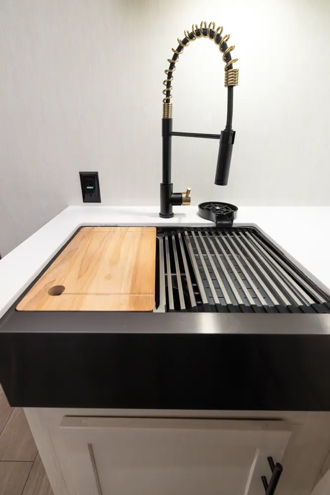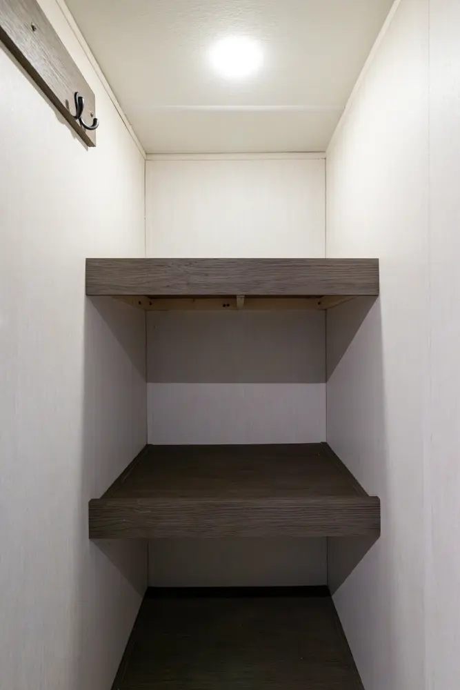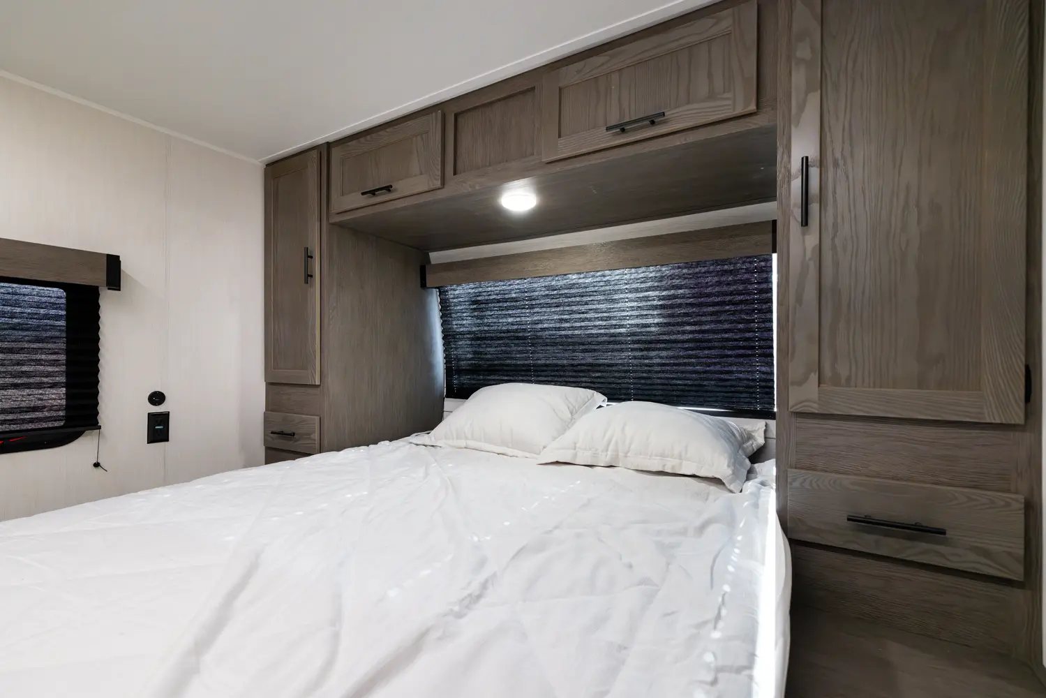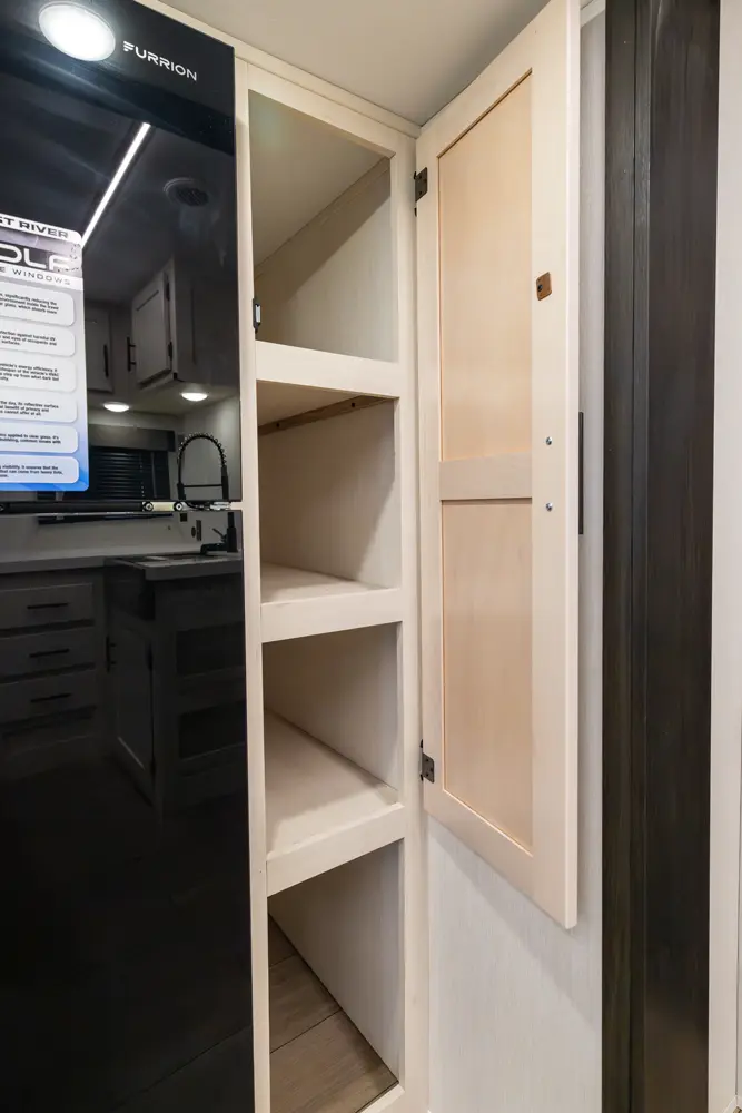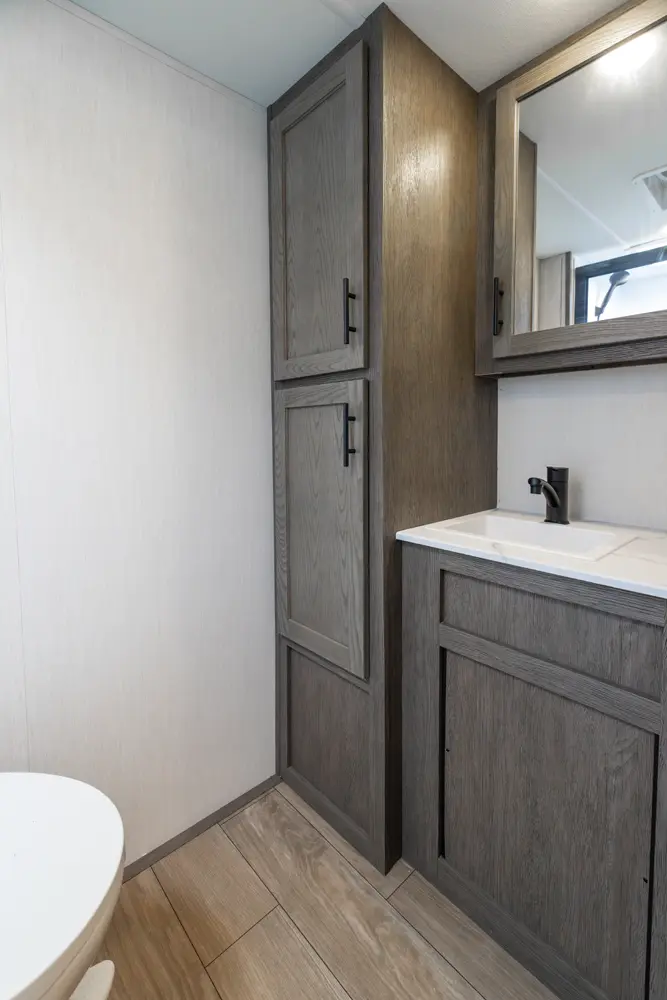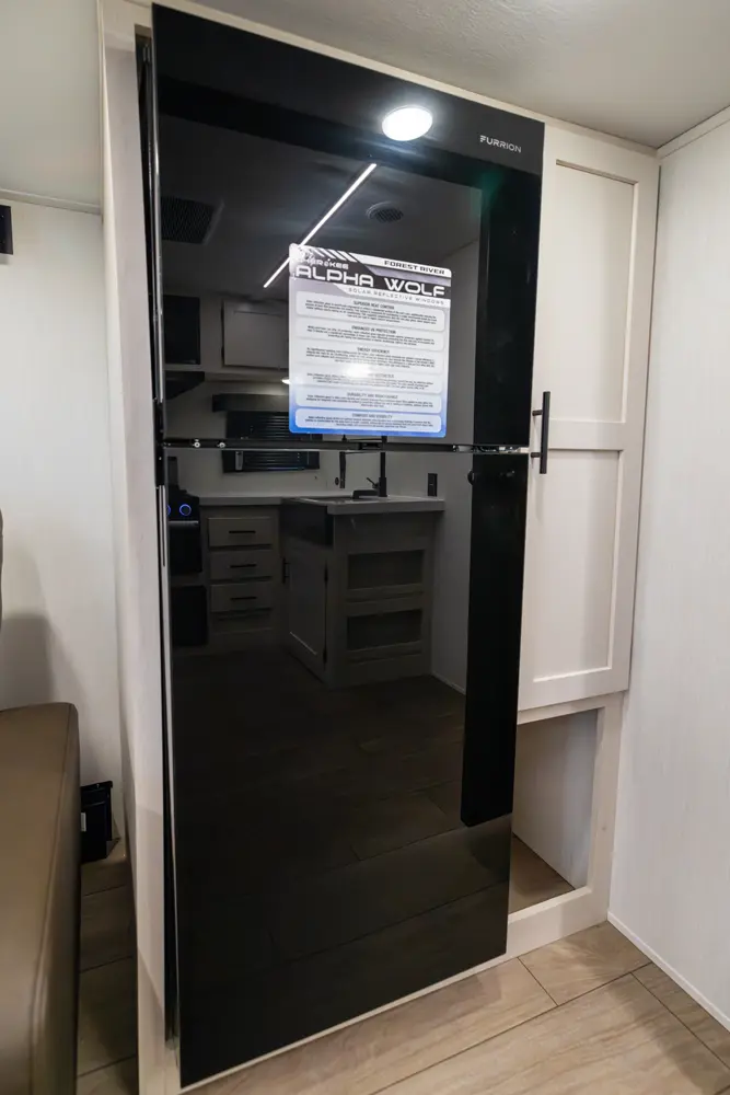 Meet the Alpha Wolf 22SW by Forest River; a lightweight 27ft travel trailer that's PACKED with big amenities! Relax in the theatre seats directly across from your cozy fireplace and entertainment center. There's also a removable table that connects to the sofa when it's time for a meal. The kitchen features a walk-in pantry, 12-volt refrigerator, farm style sink, oven, microwave and lots of storage. In the rear is a full bathroom and up front you'll find a queen bed and two wardrobes.