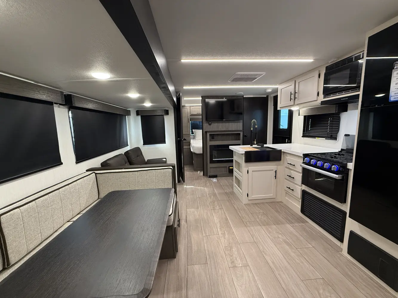 Available with either a bunk room or an extra bedroom with queen bed, the Alpha Wolf 280QBS by Forest River is a great option for families needing to maximize space in a form factor under 35 ft. A U-shaped dinette in the kitchen allows for plenty of seating and doubles as an extra bed when not in use. The living room features a cozy fireplace, TV hookups and a sofa also converts into extra sleeping. Relax up front with a queen size bed, laundry chute and plenty of wardrobe space.