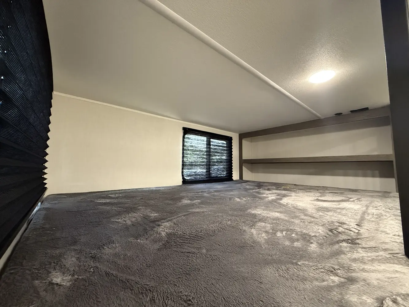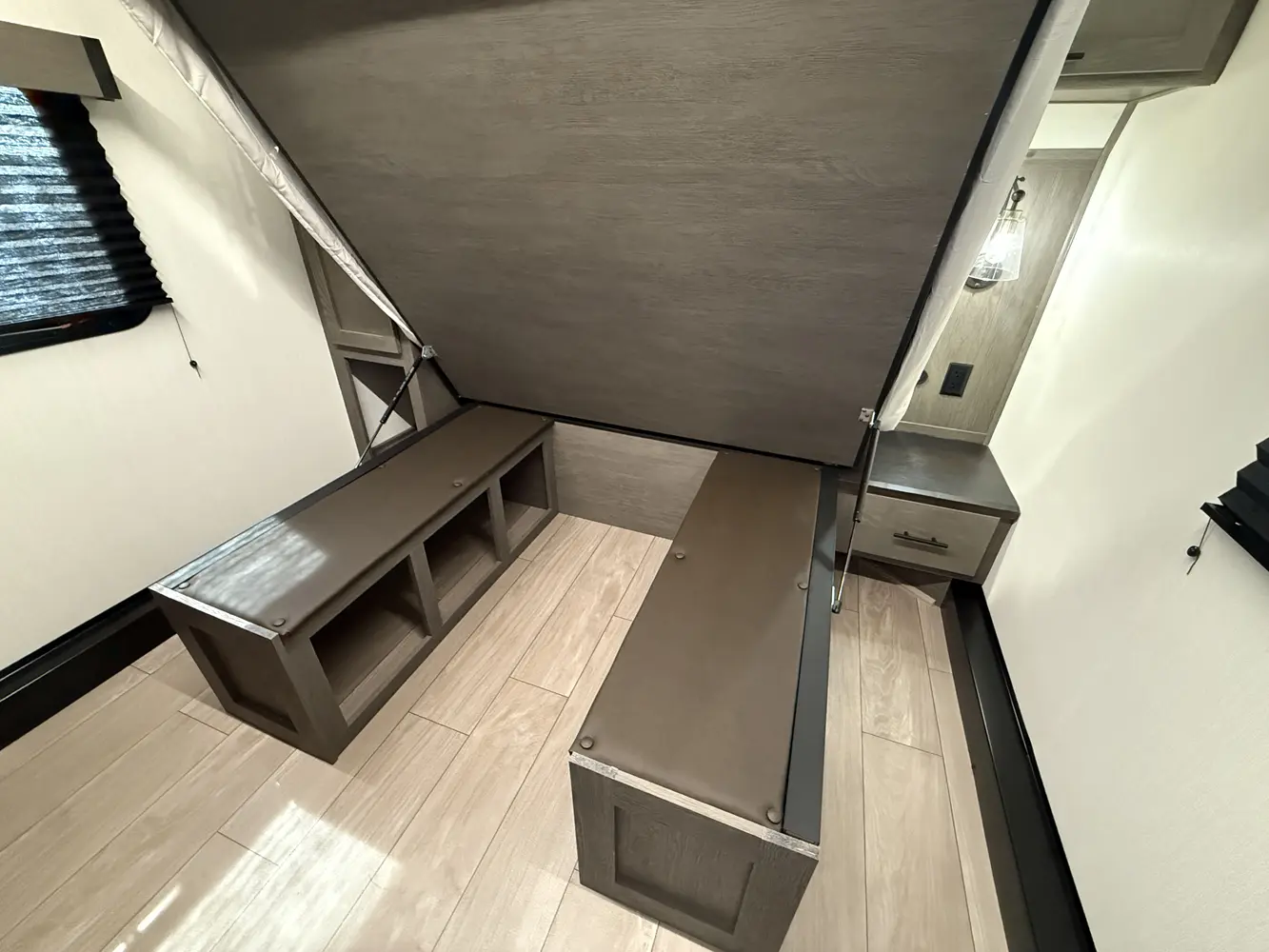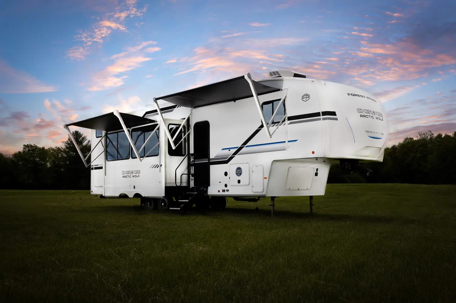 The Arctic Wolf 331BH by Forest River offers a two-bedroom design in a relatively short 38 ft 3 in form factor. In the rear is a half bathroom, 54x74 bunk, built in wardrobe storage and a 60x80 loft bunk overhead. Chef's will appreciate the island kitchen that features a 12-volt refrigerator, microwave, oven, trash can drawer, breakfast hutch and dinette that converts into a bed. Up front is a queen bed, two wardrobes and a full bathroom.