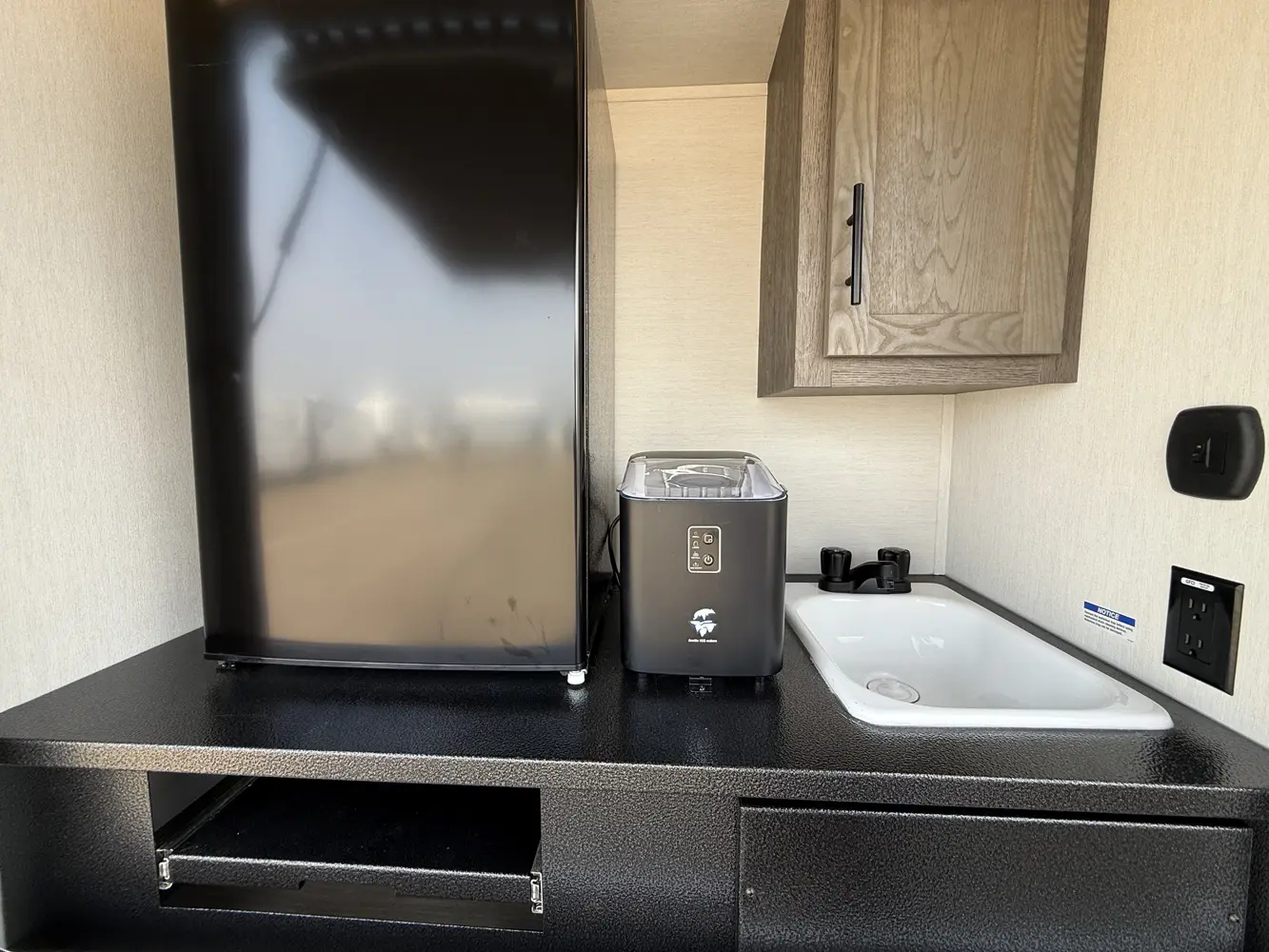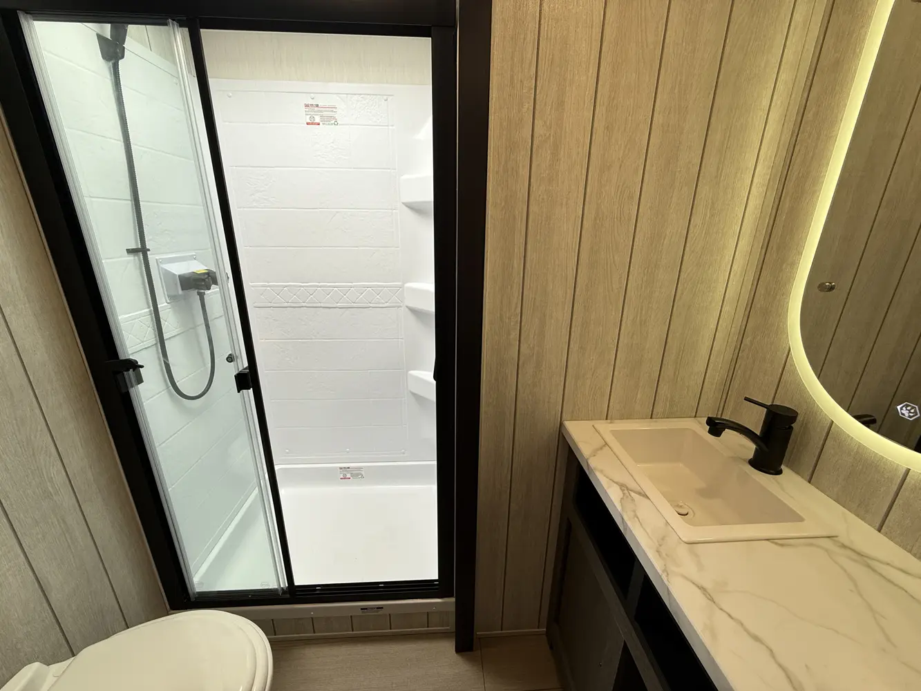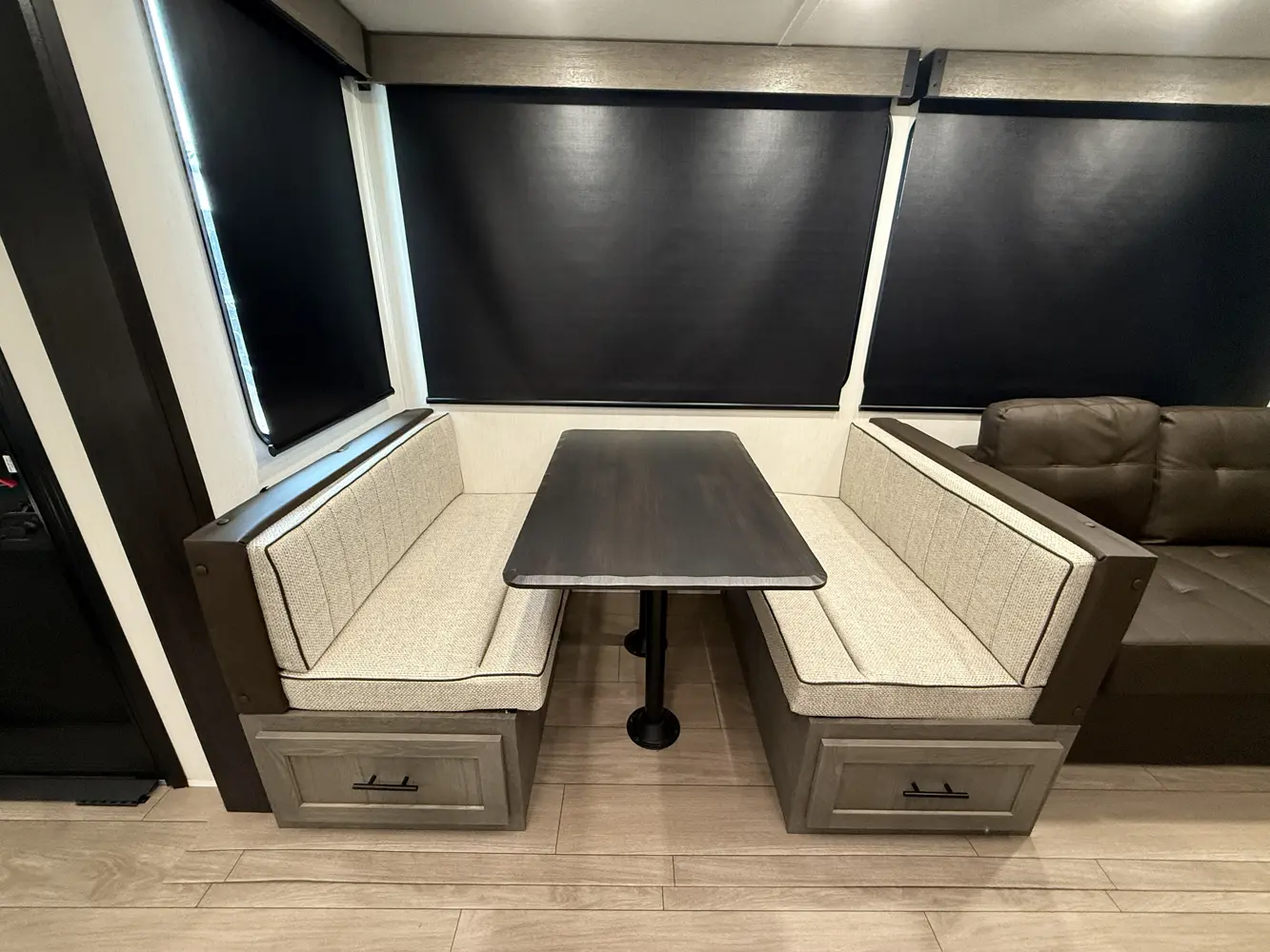 The Arctic Wolf 331BH by Forest River offers a two-bedroom design in a relatively short 38 ft 3 in form factor. In the rear is a half bathroom, 54x74 bunk, built in wardrobe storage and a 60x80 loft bunk overhead. Chef's will appreciate the island kitchen that features a 12-volt refrigerator, microwave, oven, trash can drawer, breakfast hutch and dinette that converts into a bed. Up front is a queen bed, two wardrobes and a full bathroom.