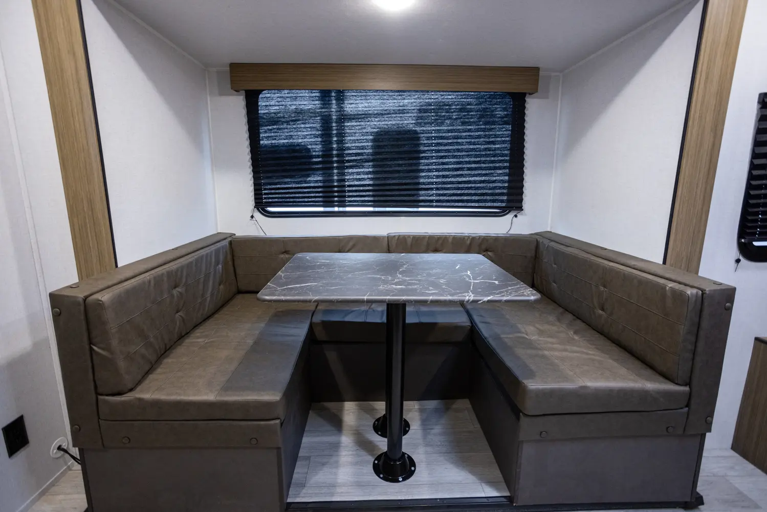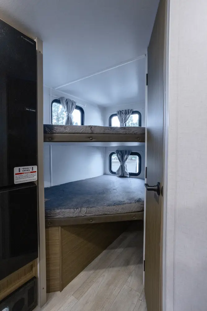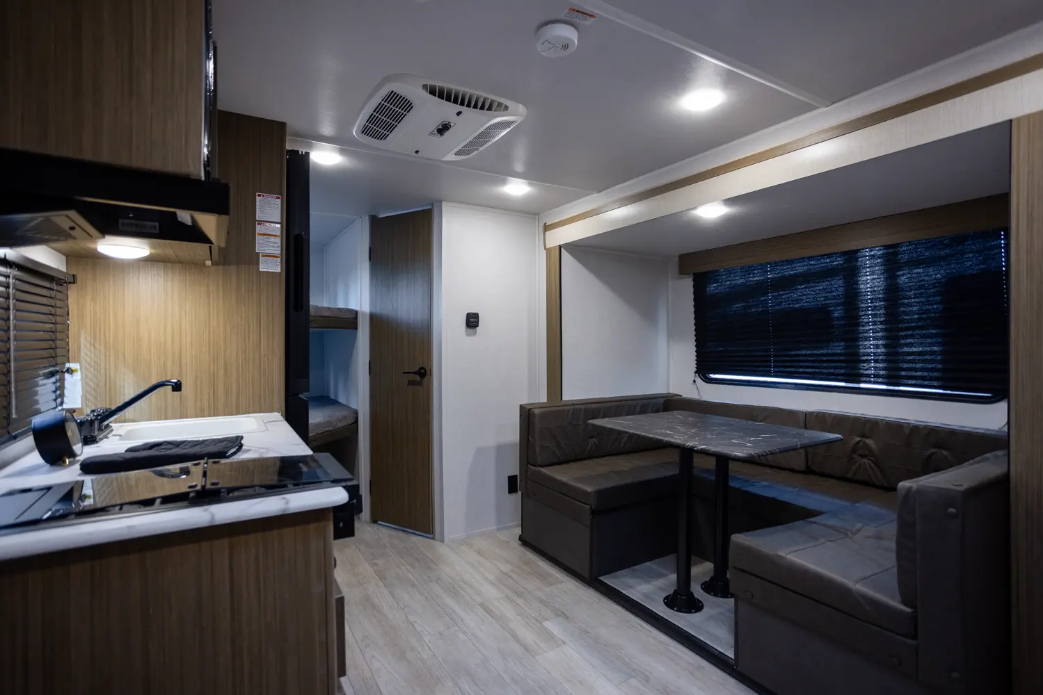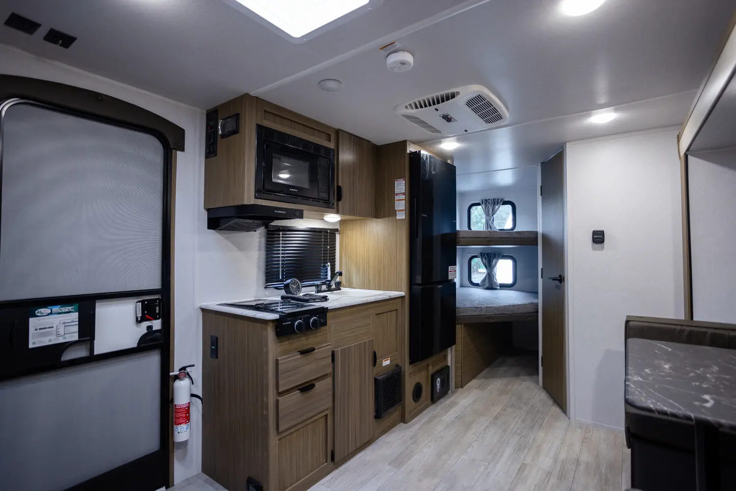 The Evo Northwest 178BHS floorplan has one entry and one slide out. Exterior features include: metal exterior, 15' awning and outside kitchen. Interiors features include: bunk beds, u-dinette and murphy bed.