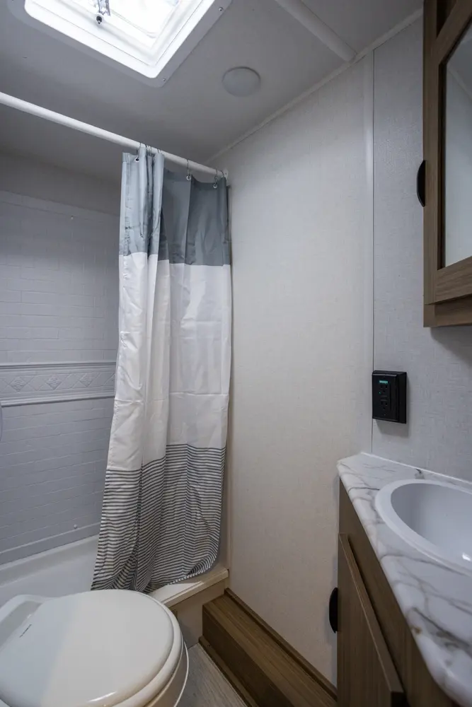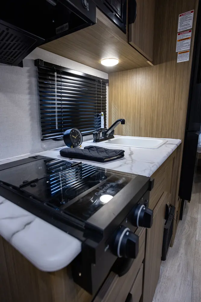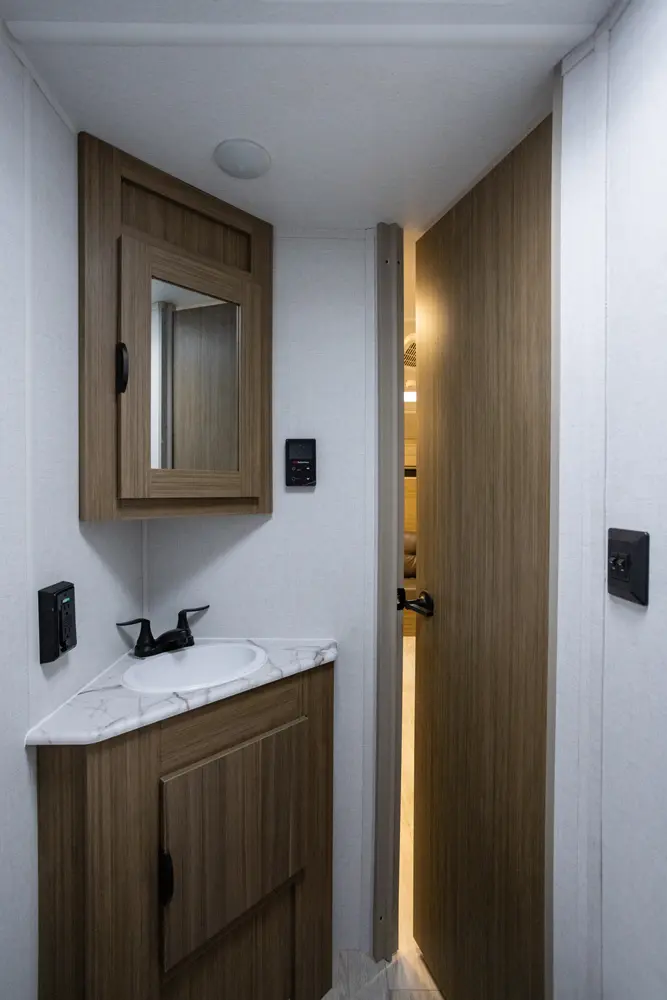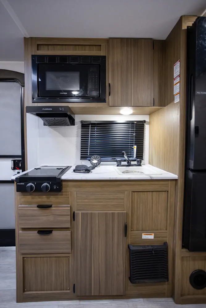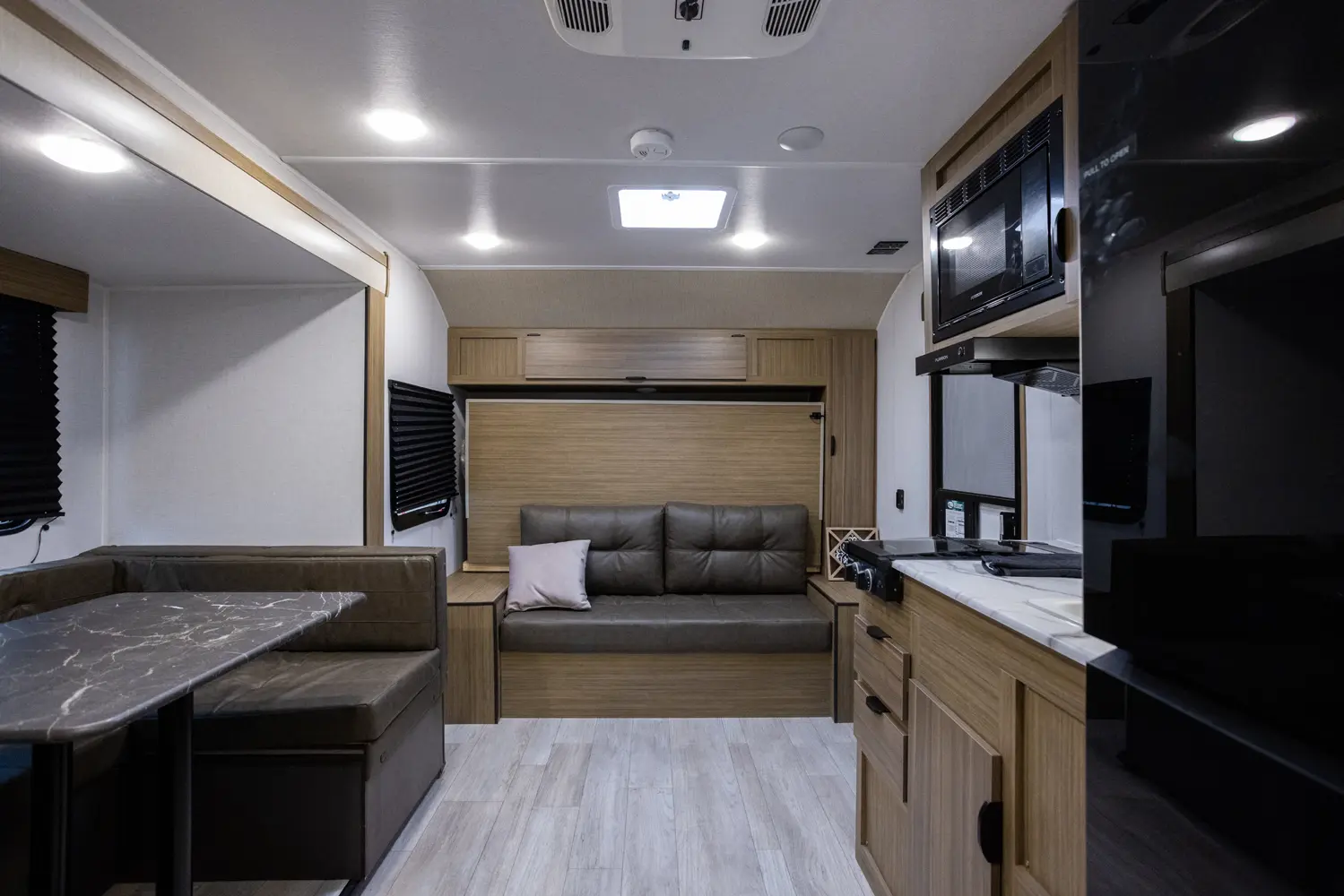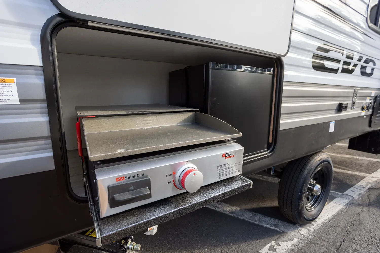 The Evo Northwest 178BHS floorplan has one entry and one slide out. Exterior features include: metal exterior, 15' awning and outside kitchen. Interiors features include: bunk beds, u-dinette and murphy bed.