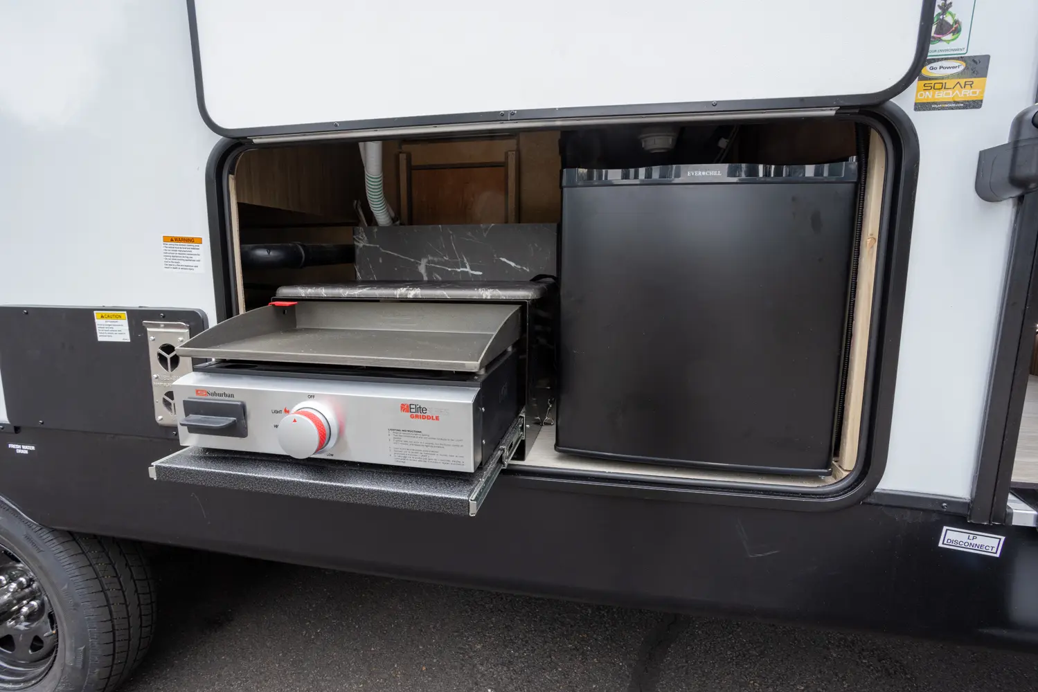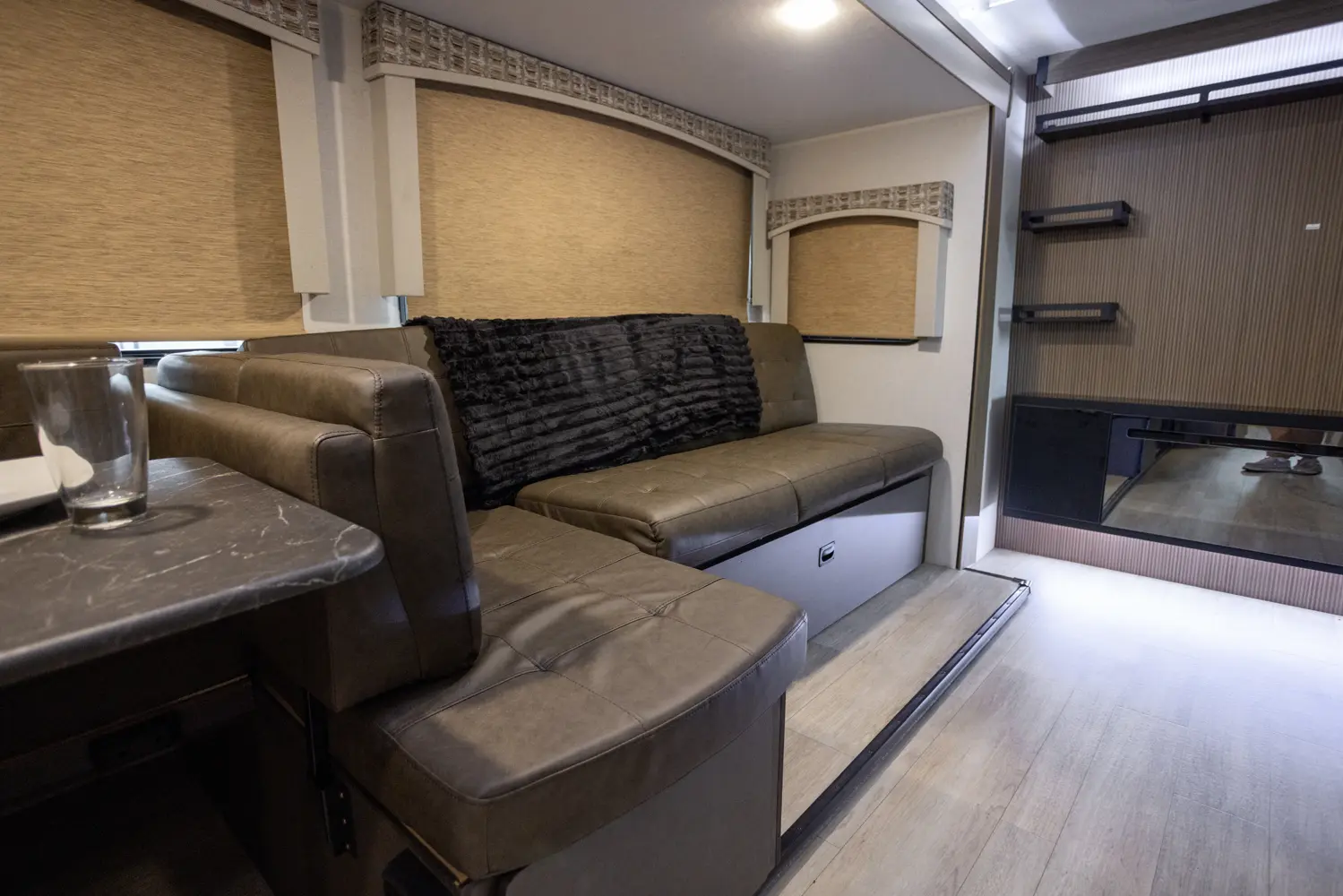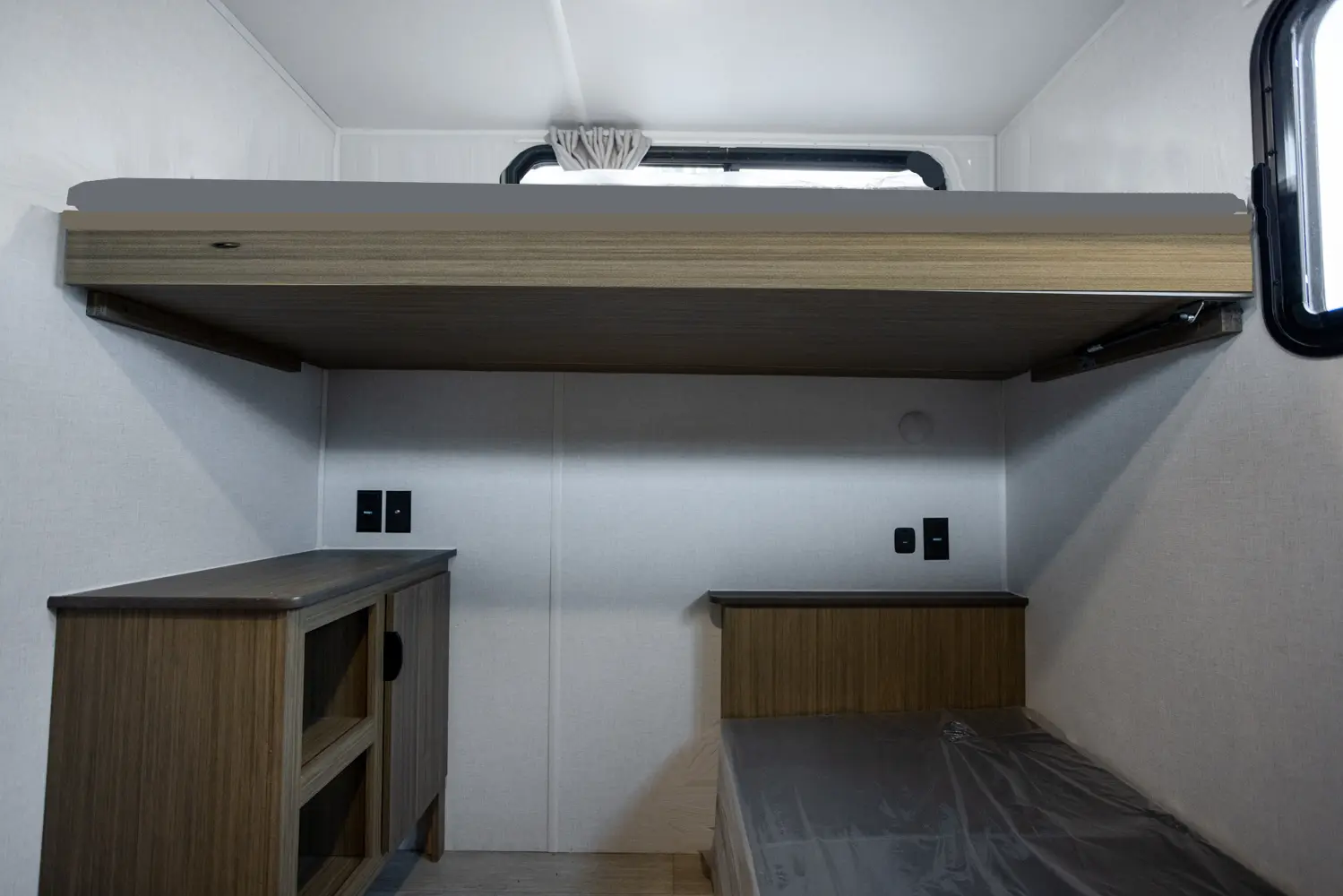 The Evo Northwest 2985VBX floorplan has one entry and one slide out. Exterior features include: fiberglass exterior, 16' awning and outside kitchen. Interiors features include: bunk beds, u-dinette and front bedroom.