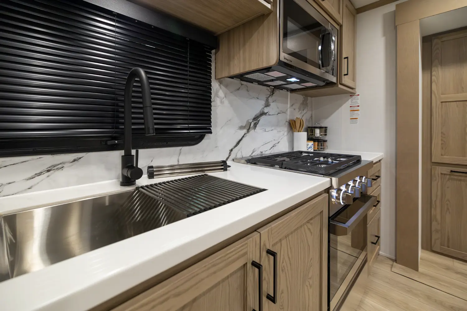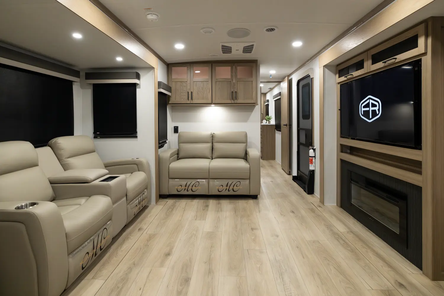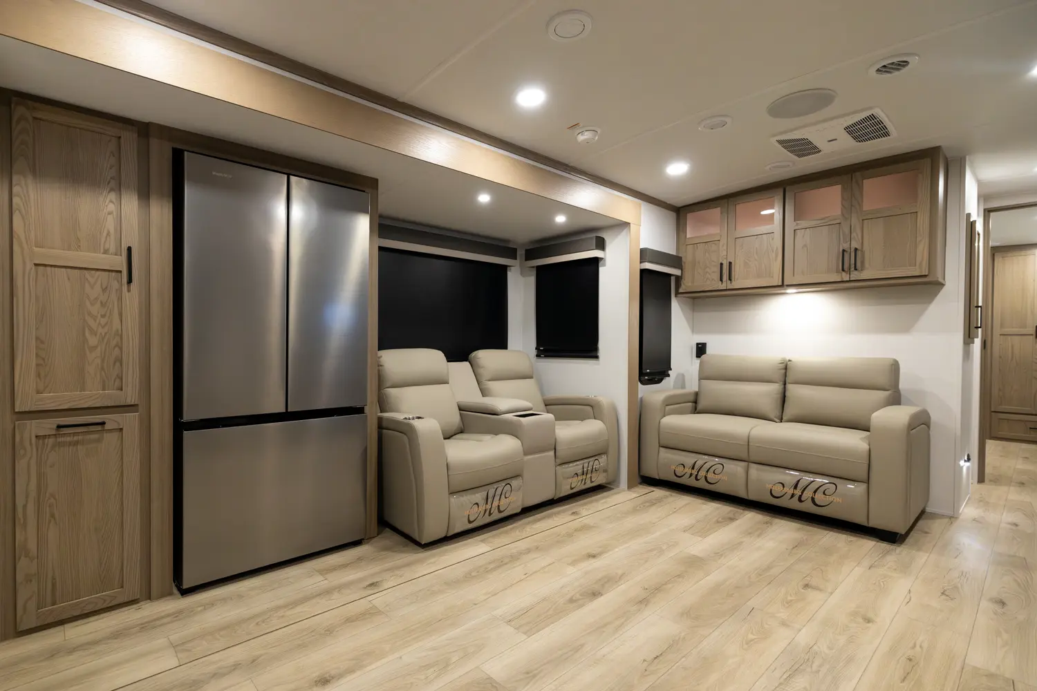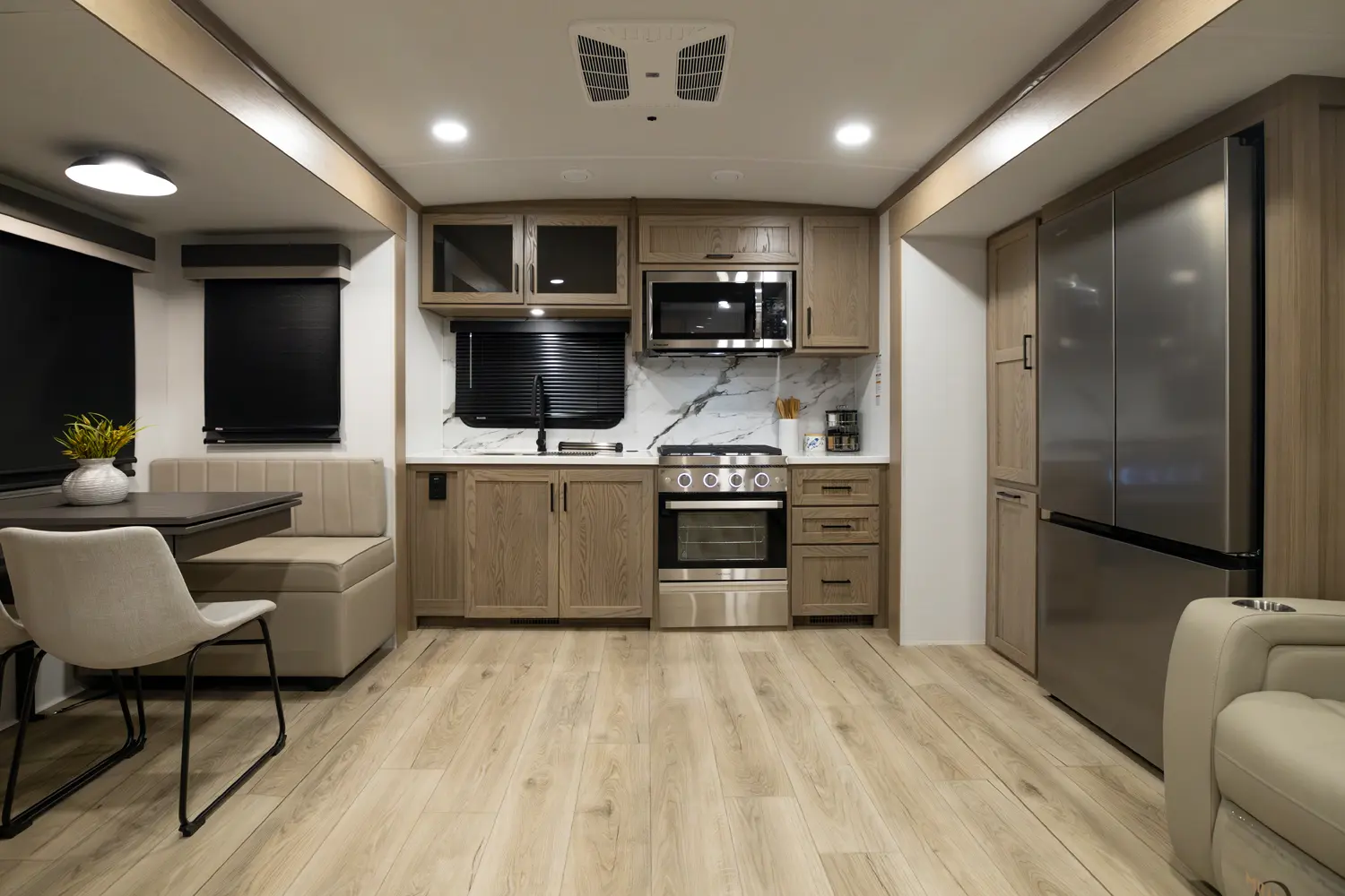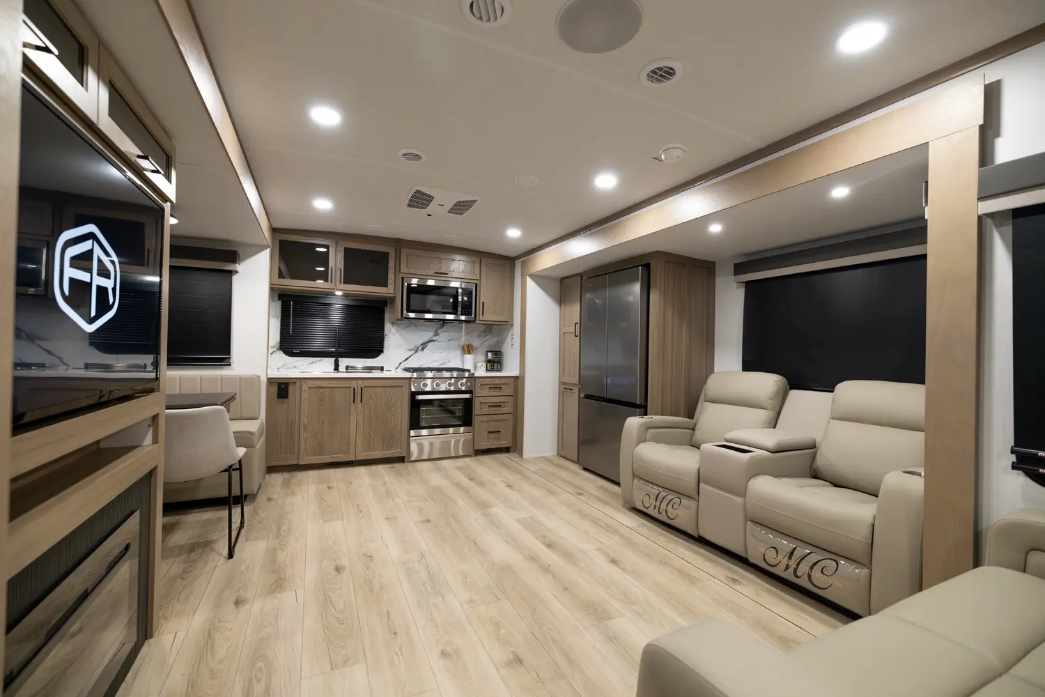 This trailer has an enormous rear kitchen area with a double slide out on each side of the unit. The 44" dinette is perfect for a night of cards or enjoying a family dinner. The living room area will fit the whole family plus more for a night of enjoying the awesome entertainment center amenities. The bedroom is equipped with a massive 72" x 80" king bed slide out and a big wardrobe that is washer and dryer prepped.
