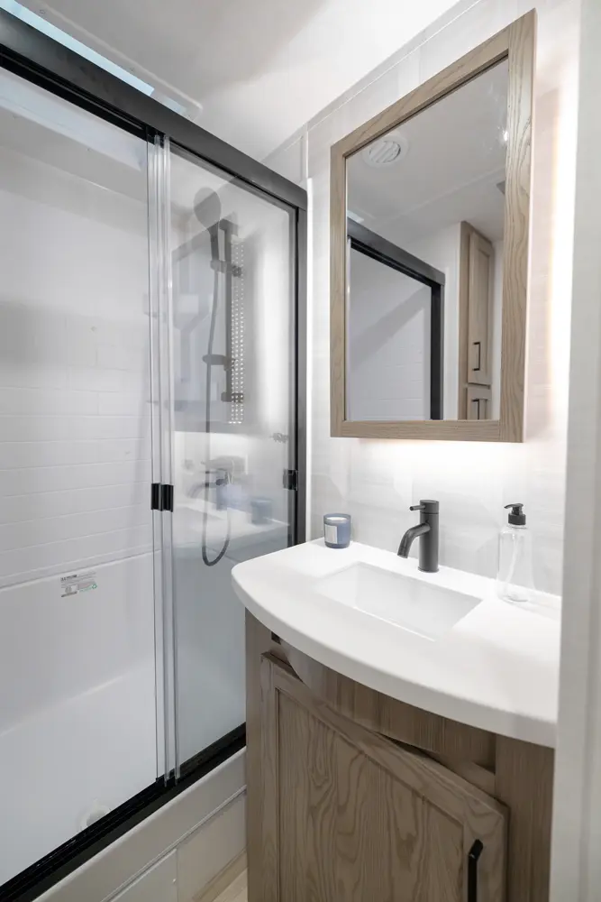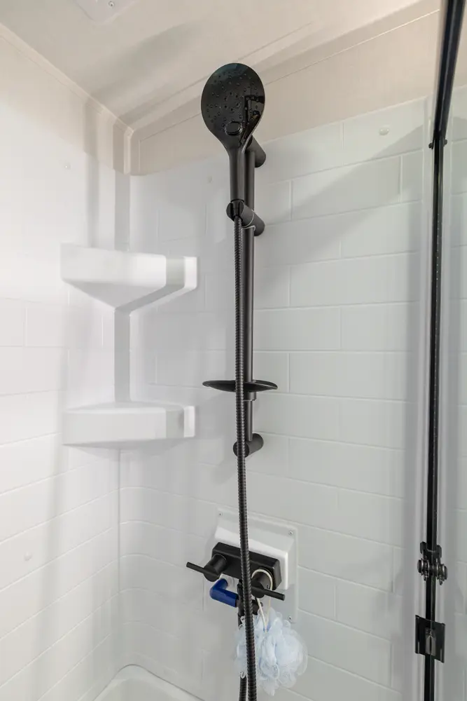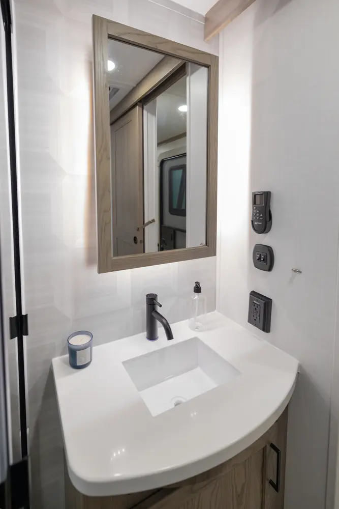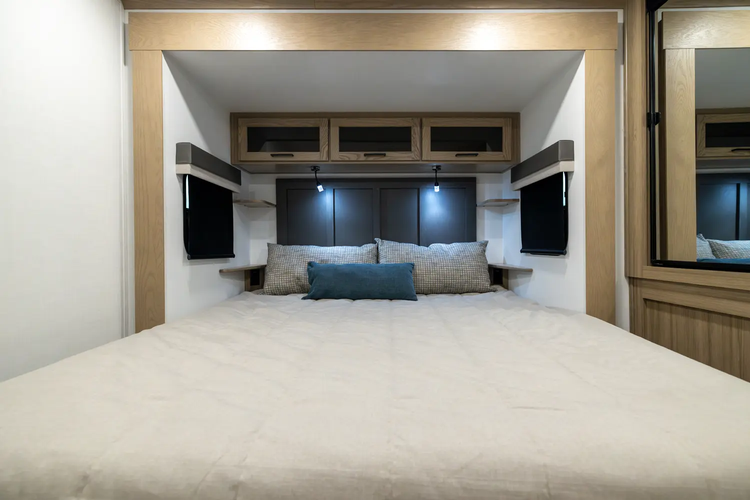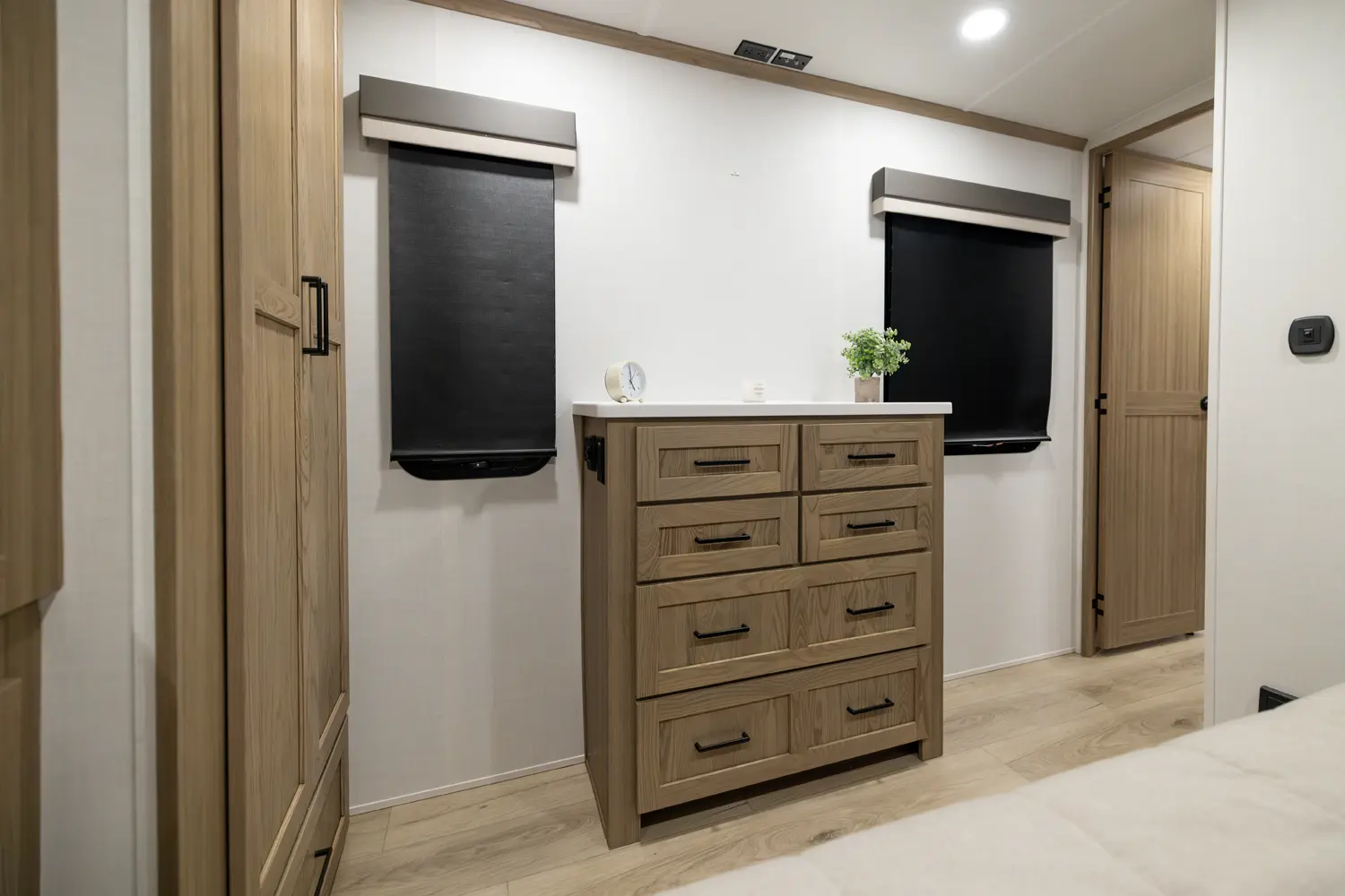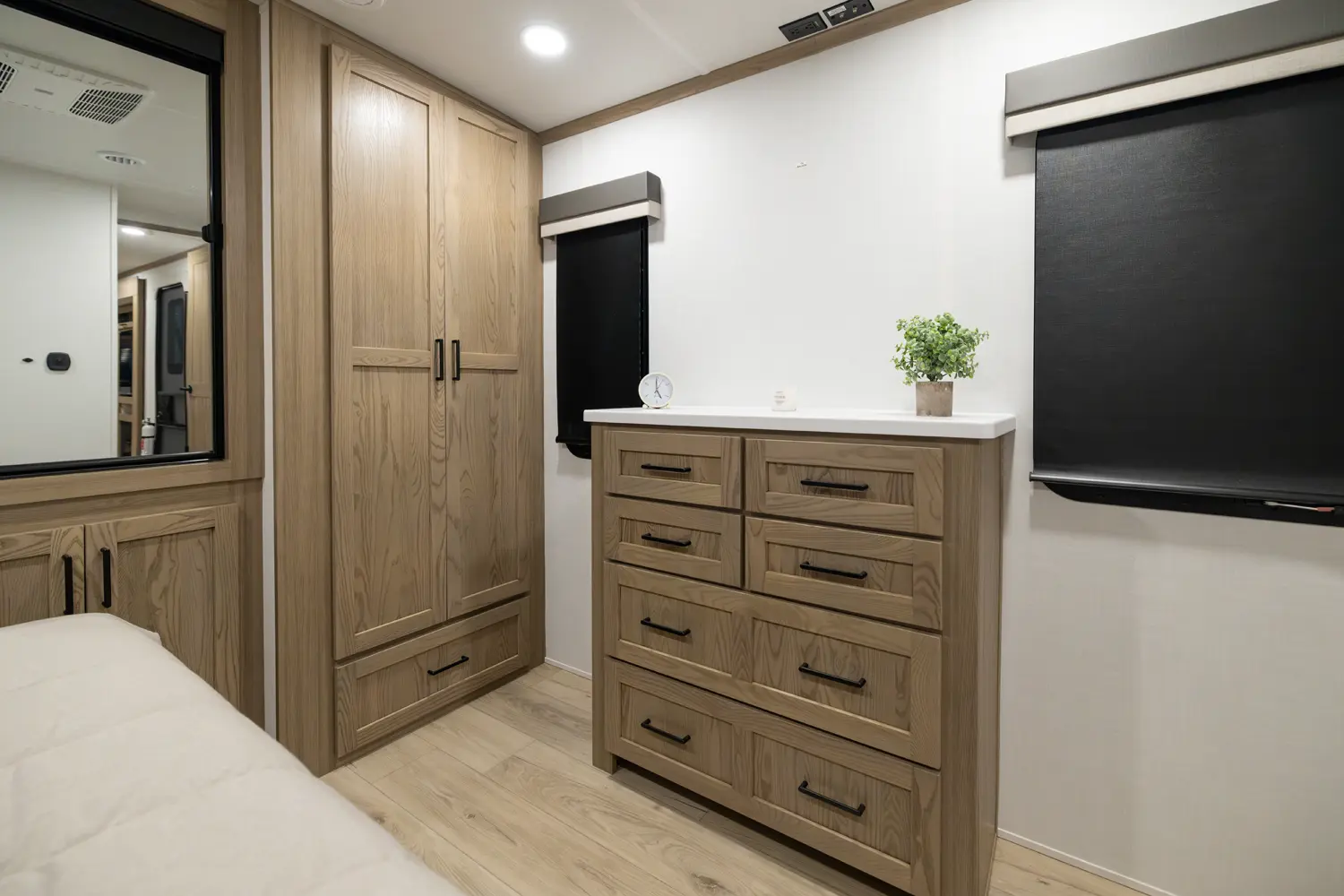 This trailer has an enormous rear kitchen area with a double slide out on each side of the unit. The 44" dinette is perfect for a night of cards or enjoying a family dinner. The living room area will fit the whole family plus more for a night of enjoying the awesome entertainment center amenities. The bedroom is equipped with a massive 72" x 80" king bed slide out and a big wardrobe that is washer and dryer prepped.