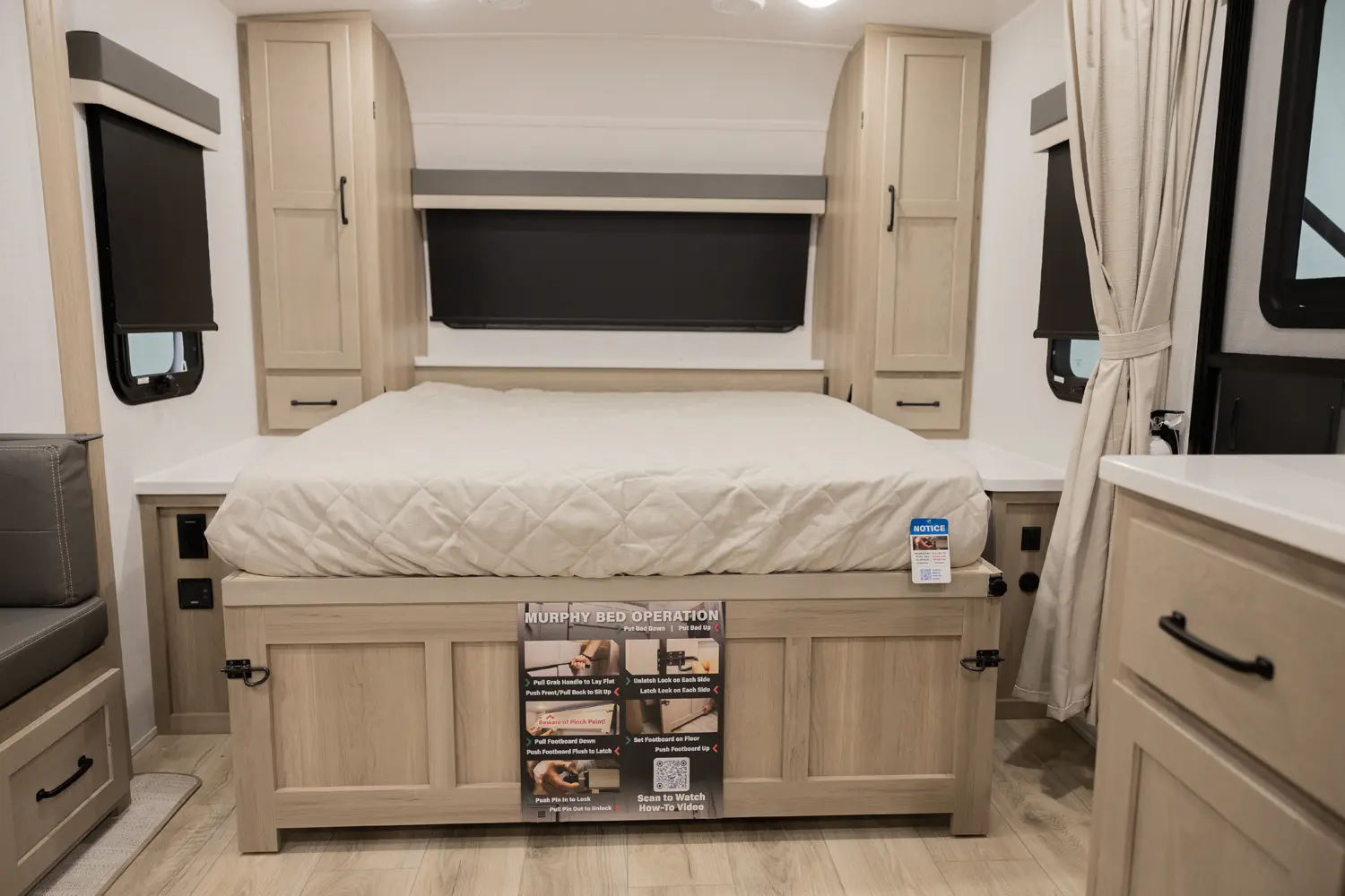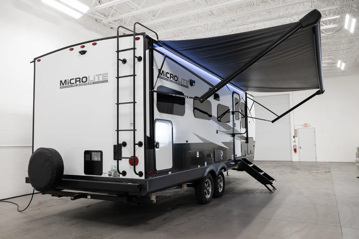 The Flagstaff Micro Lite 25DK floorplan has one entry and one slide out. Exterior features include: fiberglass exterior, 18' awning and outside kitchen. Interiors features include: u-dinette and murphy bed.