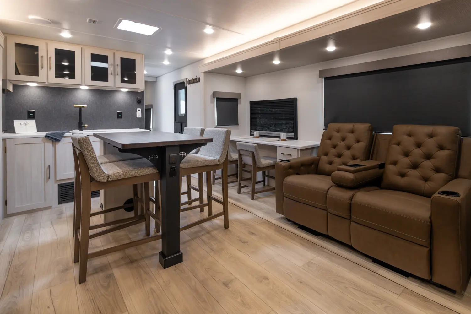 This 36' 7" travel trailer offers a spacious rear living area with dual opposing slides, creating an open, inviting space. The modern kitchen is equipped with a 10 cu. ft. 12V black glass refrigerator and a 3-burner residential-style range with glass cover. The custom king bedroom suite features ample storage, motion lighting, and a privacy wall. Exterior features include a 12' electric awning with LED lights, outdoor camp kitchen, TrailGate outdoor bar, and a hot & cold spray port.