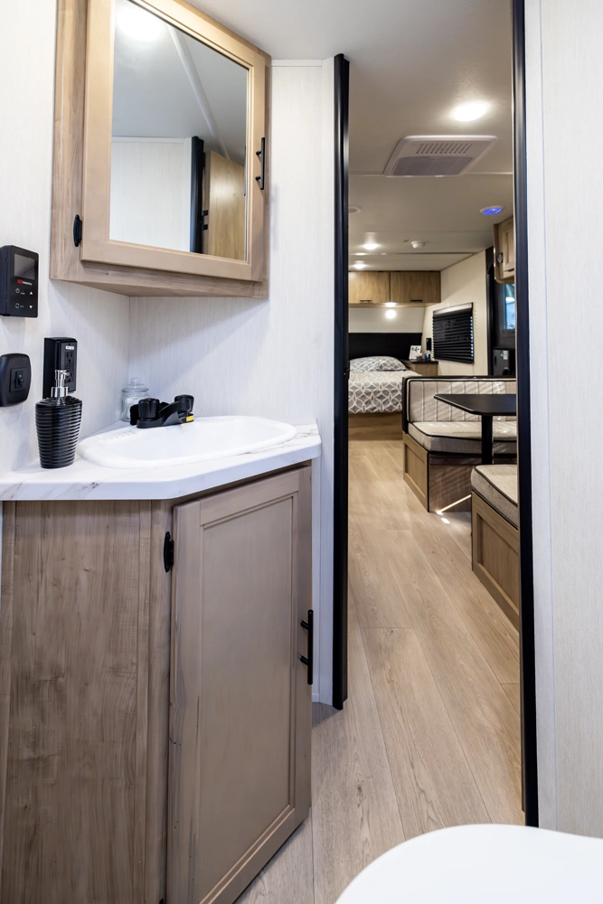 The Grey Wolf 22MKSE by Forest River is a compact and versatile travel trailer, perfect for families. The innovative Cherokee Sleep System bed transforms from a sofa into a queen-size bed, maximizing space and flexibility. The rear bunkhouse provides additional sleeping space for kids or guests. Indoor and outdoor entertainment options, along with modern amenities, make the 22MKSE a comfortable and convenient choice for family adventures.