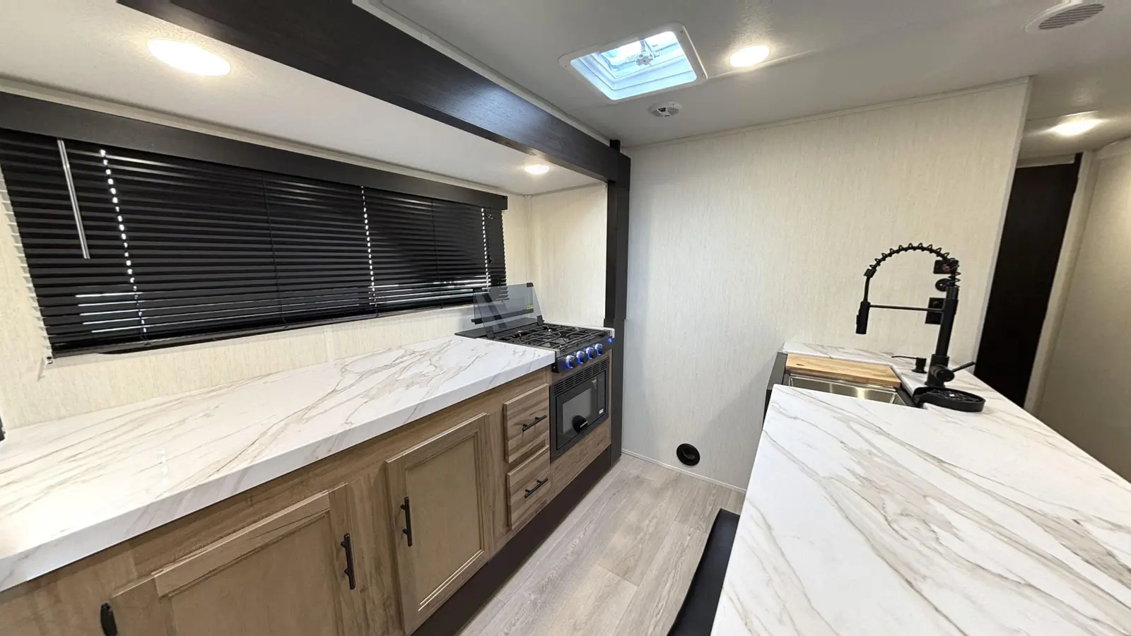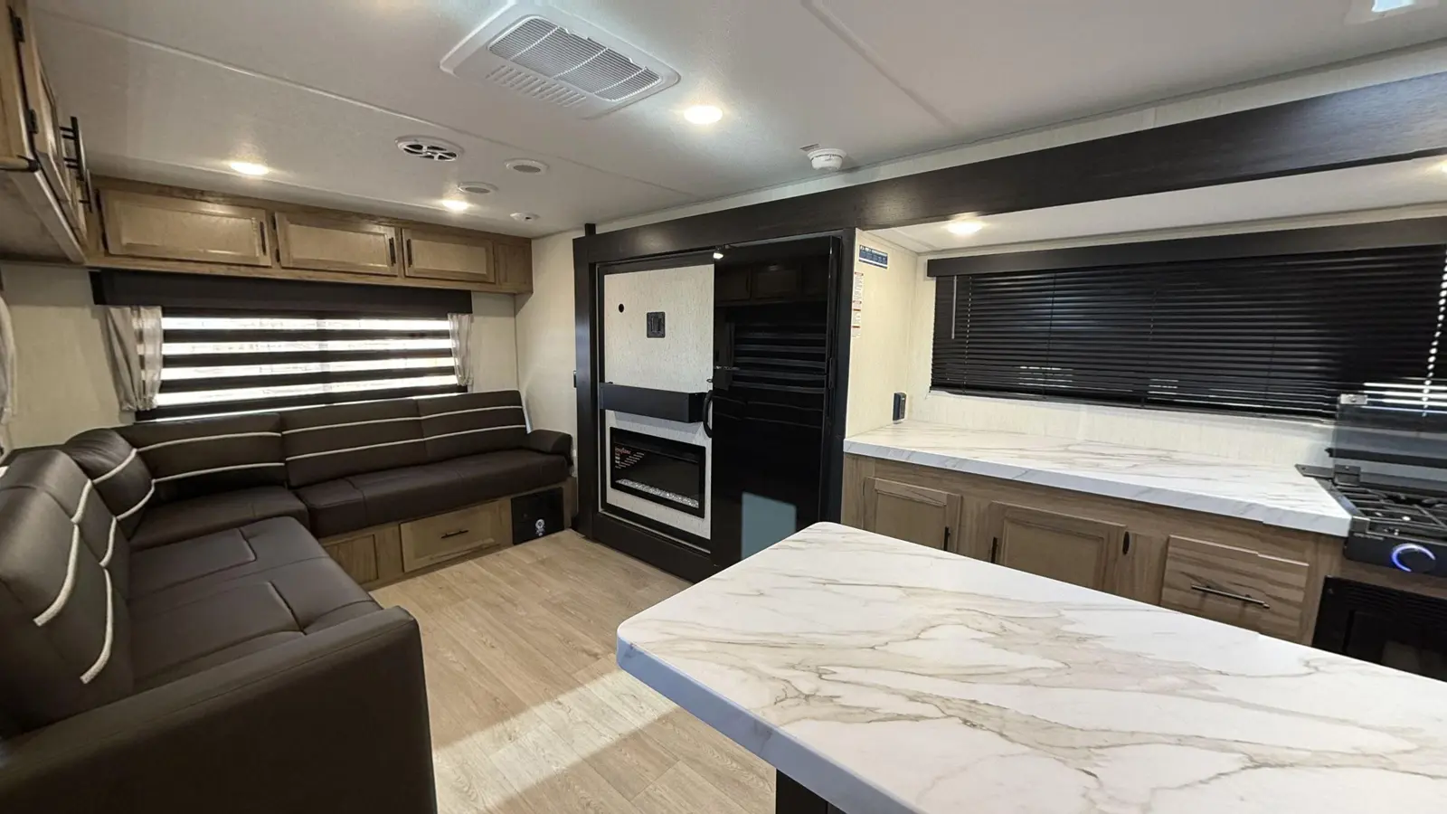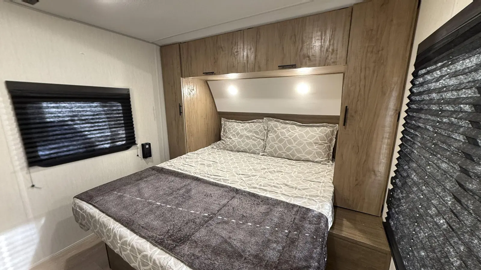 The Cherokee Grey Wolf 27LH by Forest River is a stylish and functional travel trailer with a focus on affordability, perfect for modern camping. Despite its compact 33-foot, 6-inch length, the 27LH feels incredibly spacious, thanks to its residential-style sofa and large windows that flood the interior with natural light. The bedroom is also impressive with a king size bed and plenty of wardrobe space.