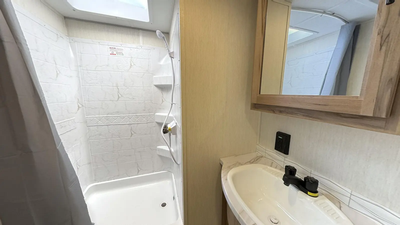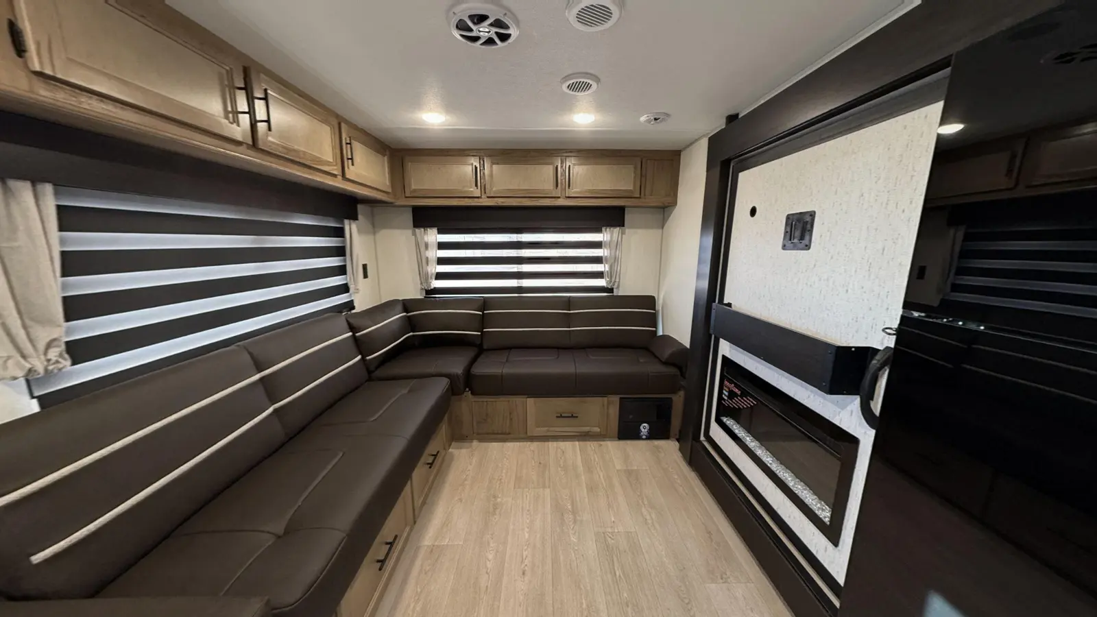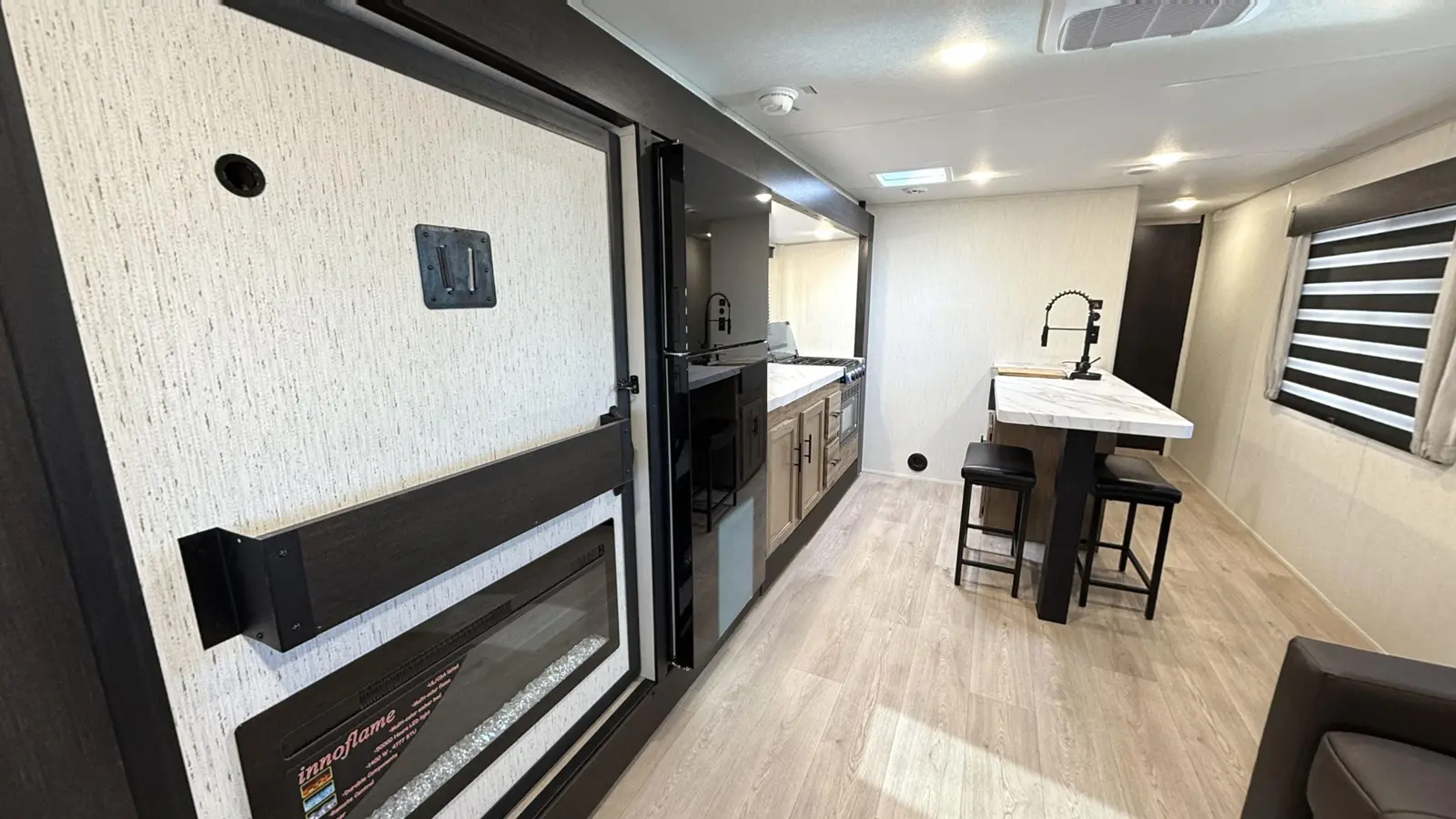 The Cherokee Grey Wolf 27LH by Forest River is a stylish and functional travel trailer with a focus on affordability, perfect for modern camping. Despite its compact 33-foot, 6-inch length, the 27LH feels incredibly spacious, thanks to its residential-style sofa and large windows that flood the interior with natural light. The bedroom is also impressive with a king size bed and plenty of wardrobe space.