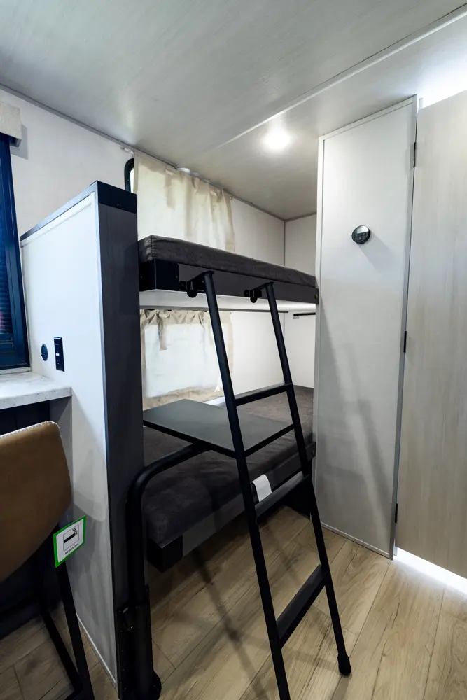 The 16MKD is a nimble, family-friendly travel trailer that delivers big comfort in a manageable 21'8" design. A front queen bed offers a cozy retreat for adults, while twin bunks are perfect for kids or guests. The full rear-corner bath adds privacy and convenience, making this trailer ideal for both quick getaways and extended adventures. Compact, capable, and thoughtfully designed — the 16MKD makes family travel effortless.
