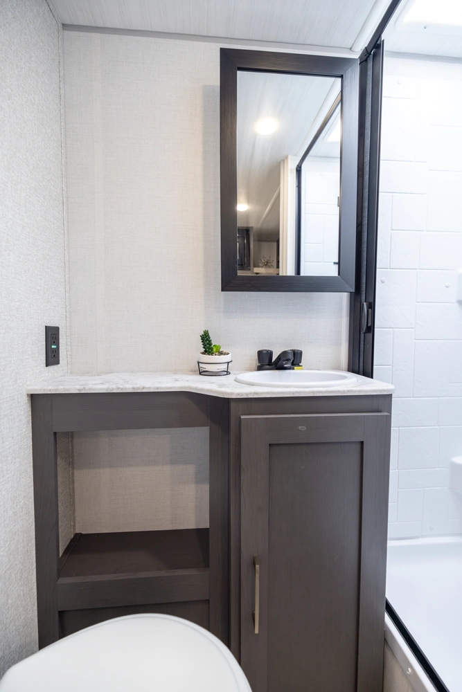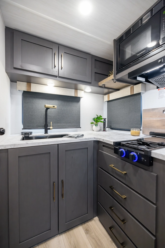The 16MRJ is a rugged yet refined travel trailer that delivers full-feature comfort in a compact, adventure-ready design. A front queen bed offers a restful retreat, while the central kitchen and lounge area make meal prep and relaxation effortless. Outside, a 12' awning and easy-access storage keep you connected to the outdoors. Lightweight, durable, and built for exploration, the 16MRJ couples the perfect lightweight retreat.