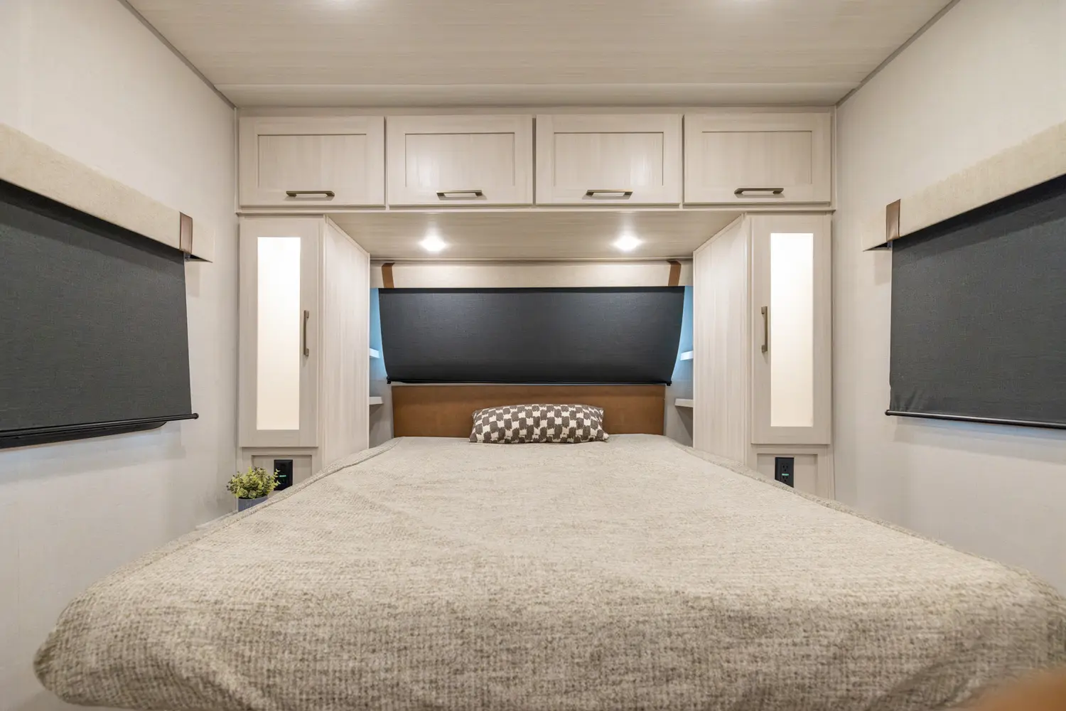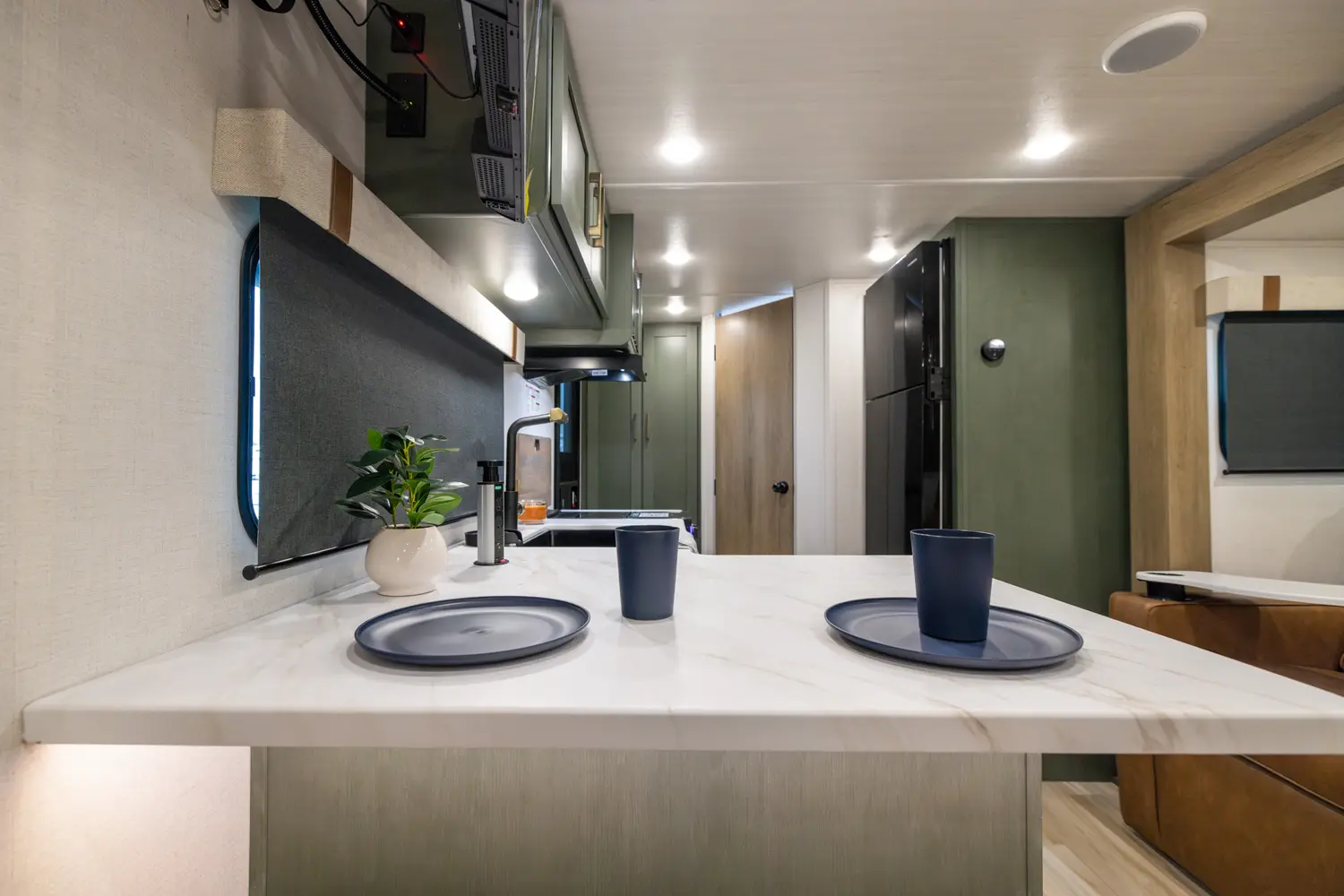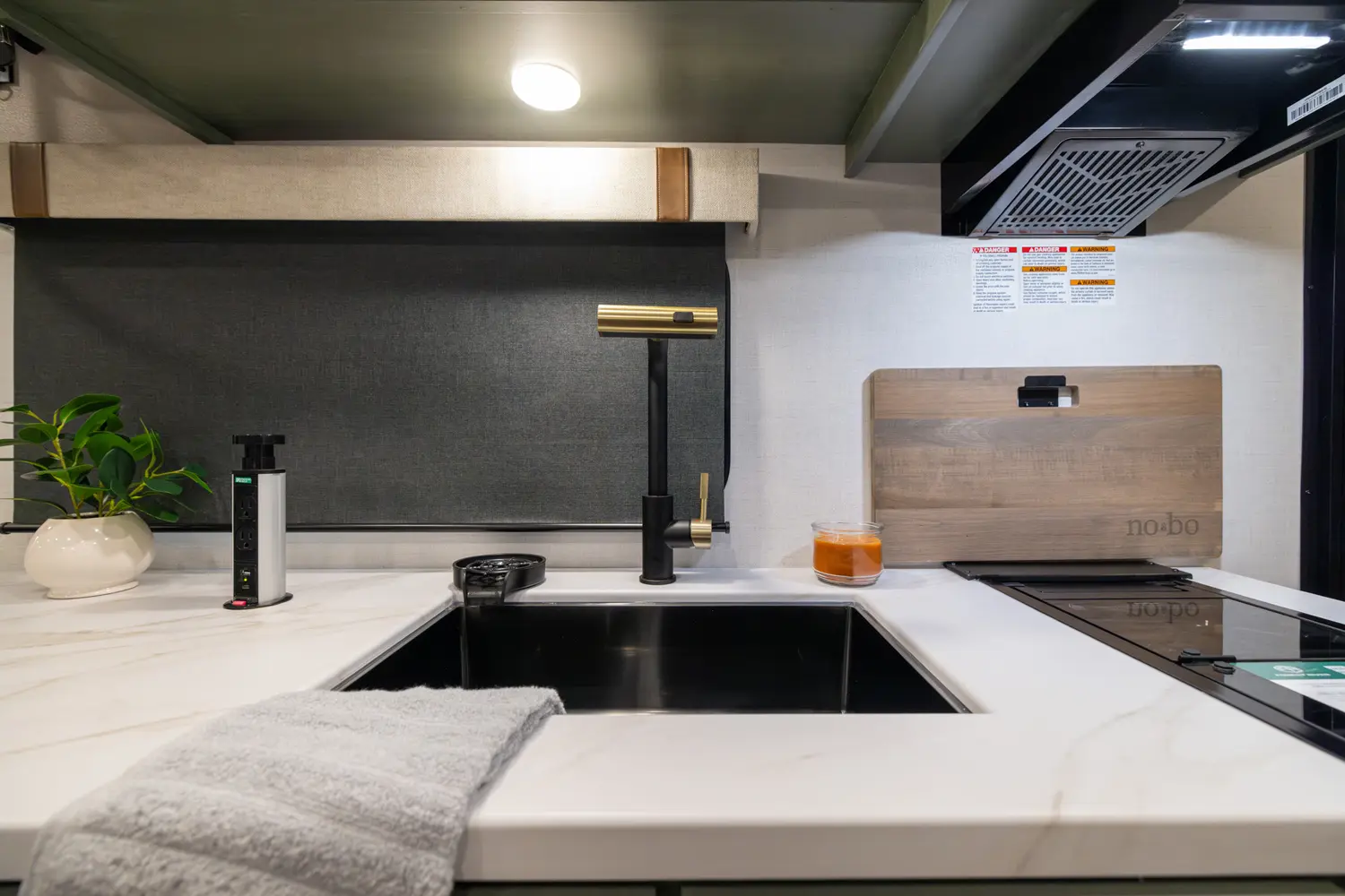 The NB19.6 is a well-designed travel trailer combining comfort and functionality. A mid-living slide-out sofa faces a fully equipped kitchen, while a front queen bed with storage and a rear full bath add convenience. Outside, an exterior kitchen and 16' awning extend living space for outdoor enjoyment. Lightweight and feature-packed, the NB19.6 delivers modern comfort and efficiency in a tow-friendly package.