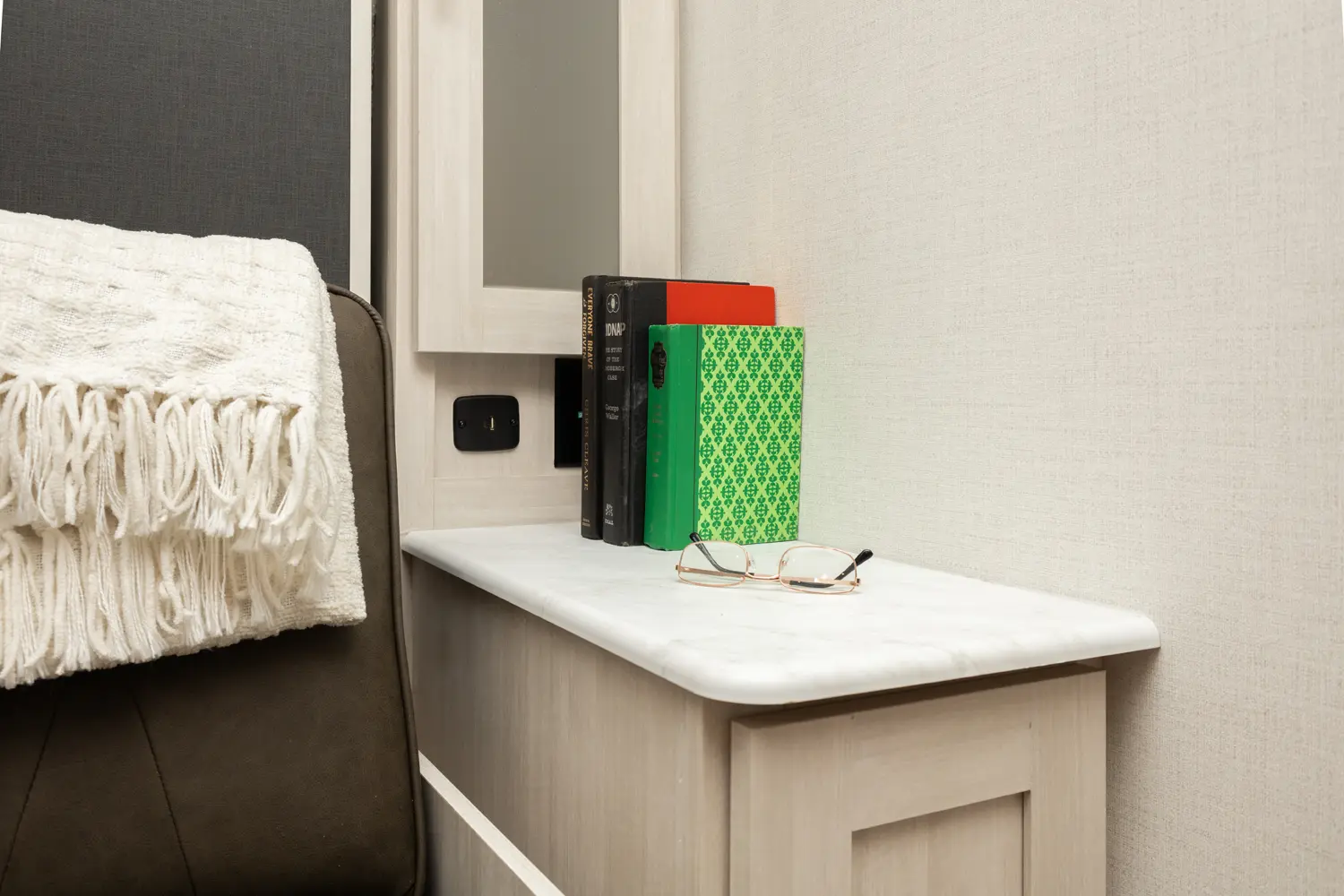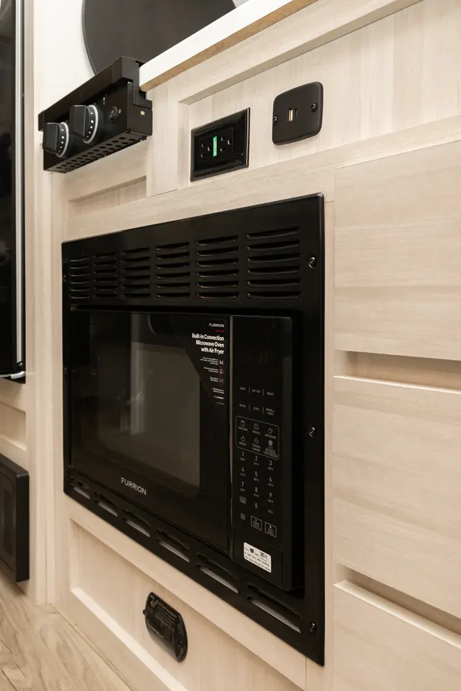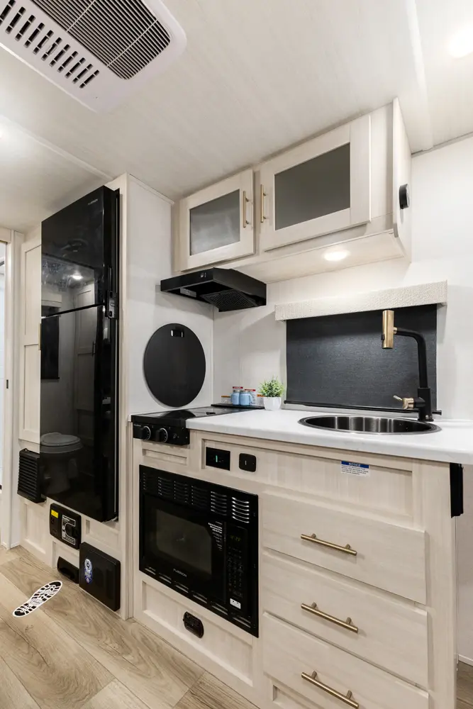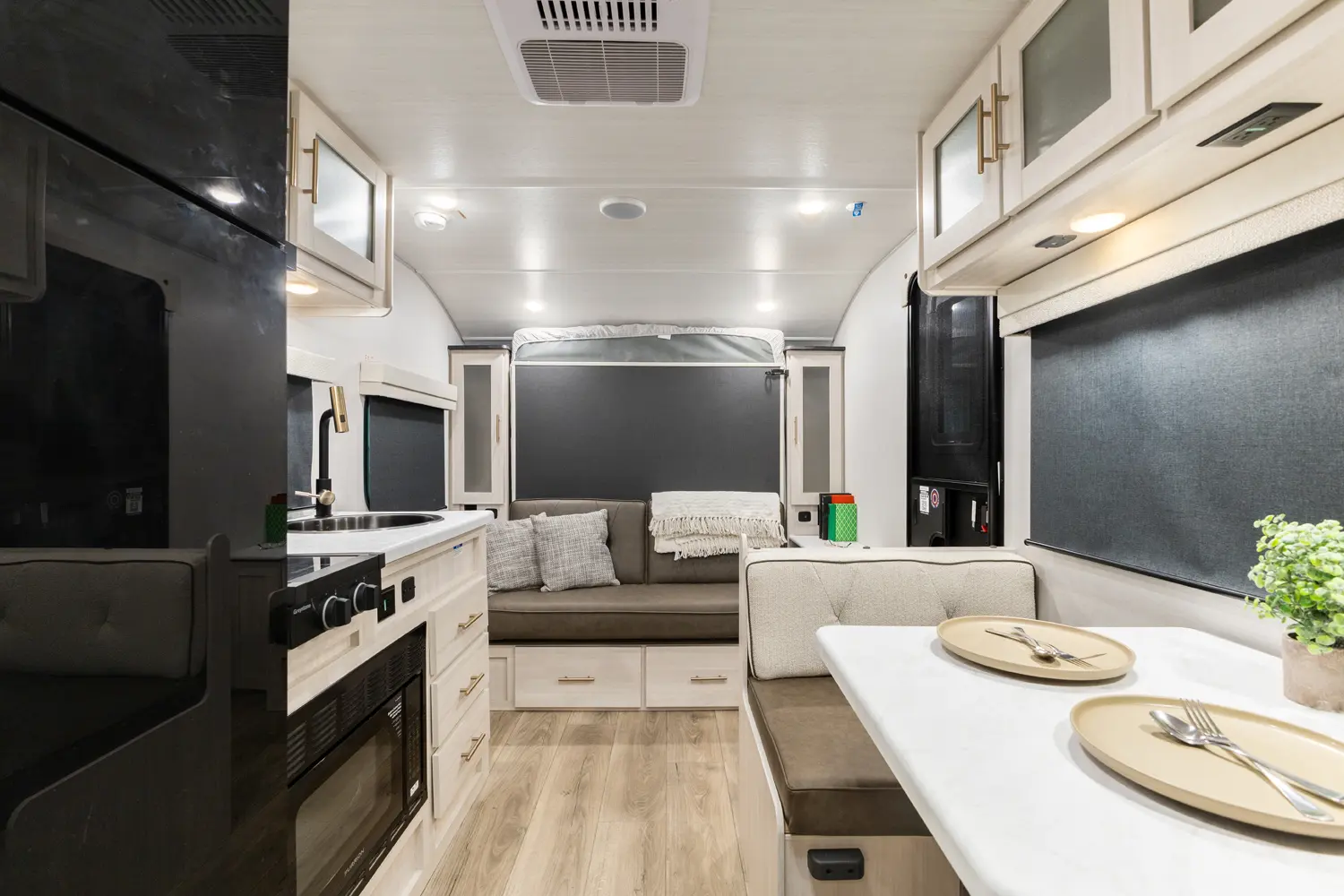 The RP-192 offers a spacious layout in a compact design. It features a versatile front Murphy bed that converts to a sofa, maximizing living space. The rear bath includes a full shower and ample wardrobe storage. A booth dinette provides dining and additional sleeping options. Modern amenities like a convection microwave, 12V refrigerator, and central vacuum system ensure comfort on the road. Ideal for couples or small families seeking a lightweight, feature-rich travel trailer.