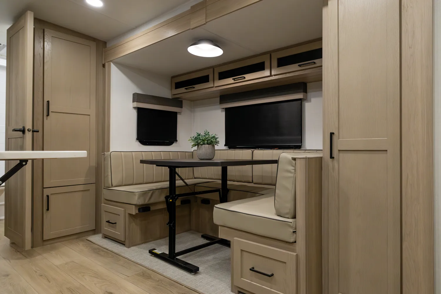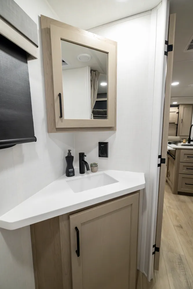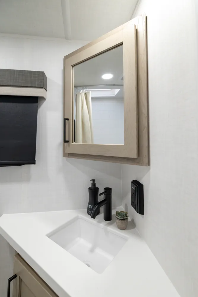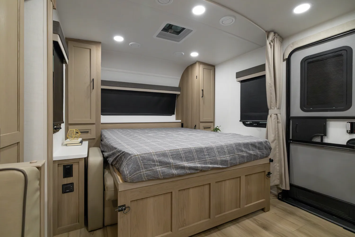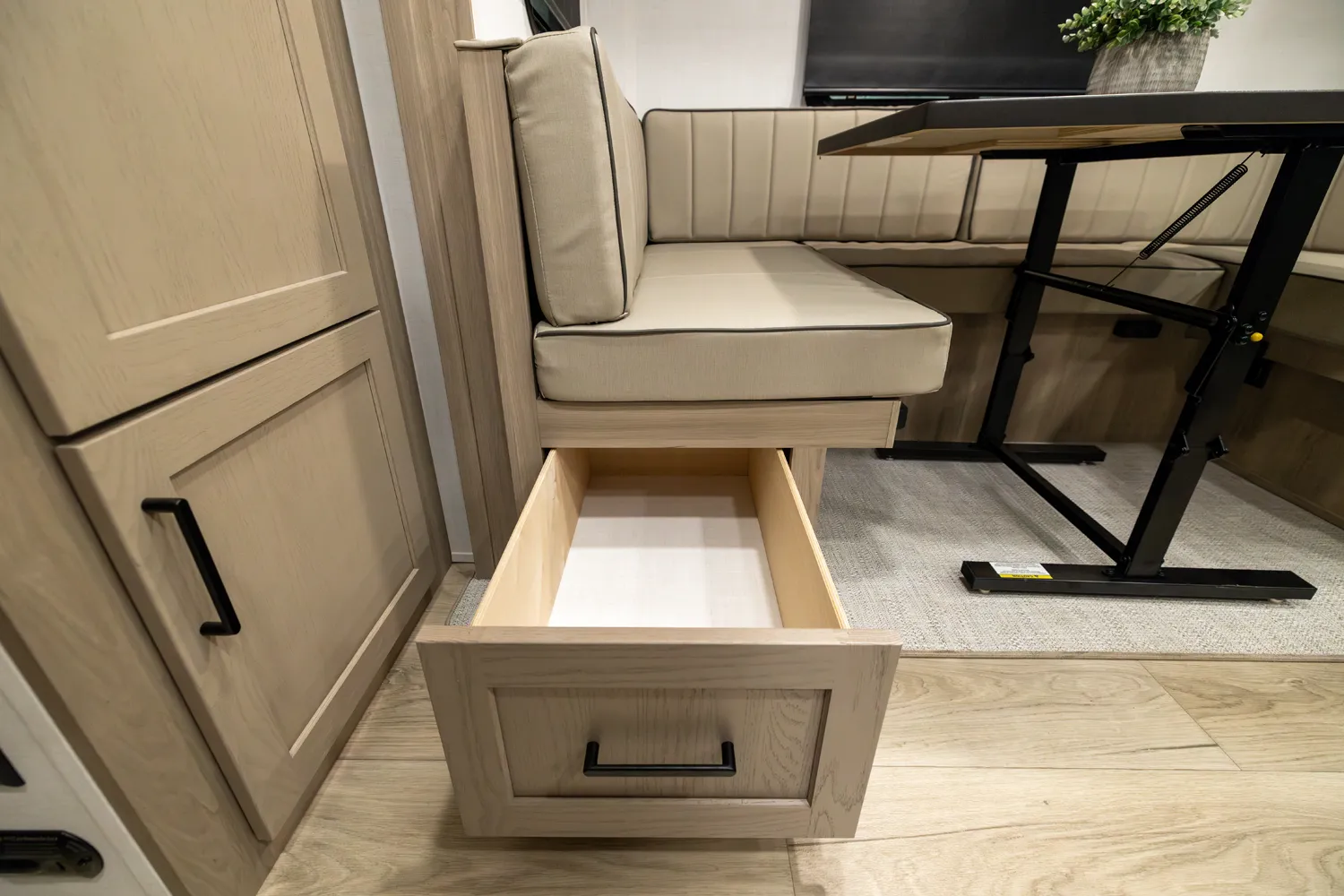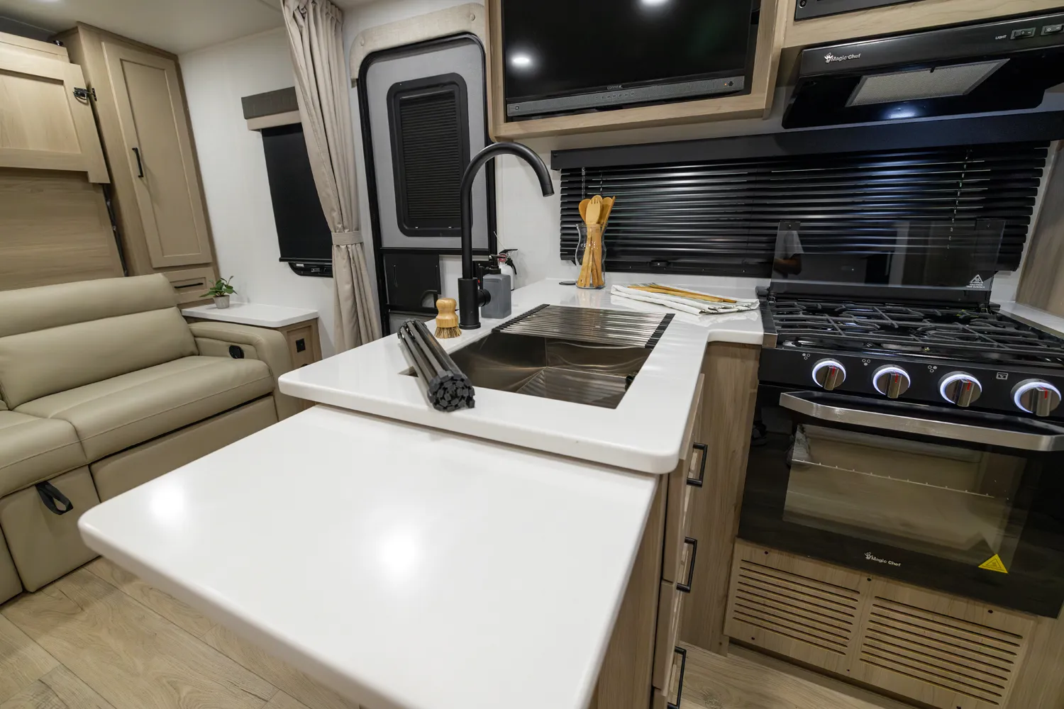This is the perfect family trailer towing under 26' feet. The double 48" X 72" bunkhouse is awesome for sleeping the kids and even fits adults comfortably. The bottom bunk folds up for even more storage and toys will fit nicely underneath! The big 60" X 74" murphy bed folds up into a sofa for daily use. The giant 18' awning goes almost all the way across your unit while covering the outside kitchen.