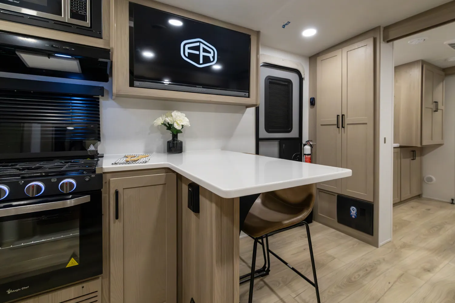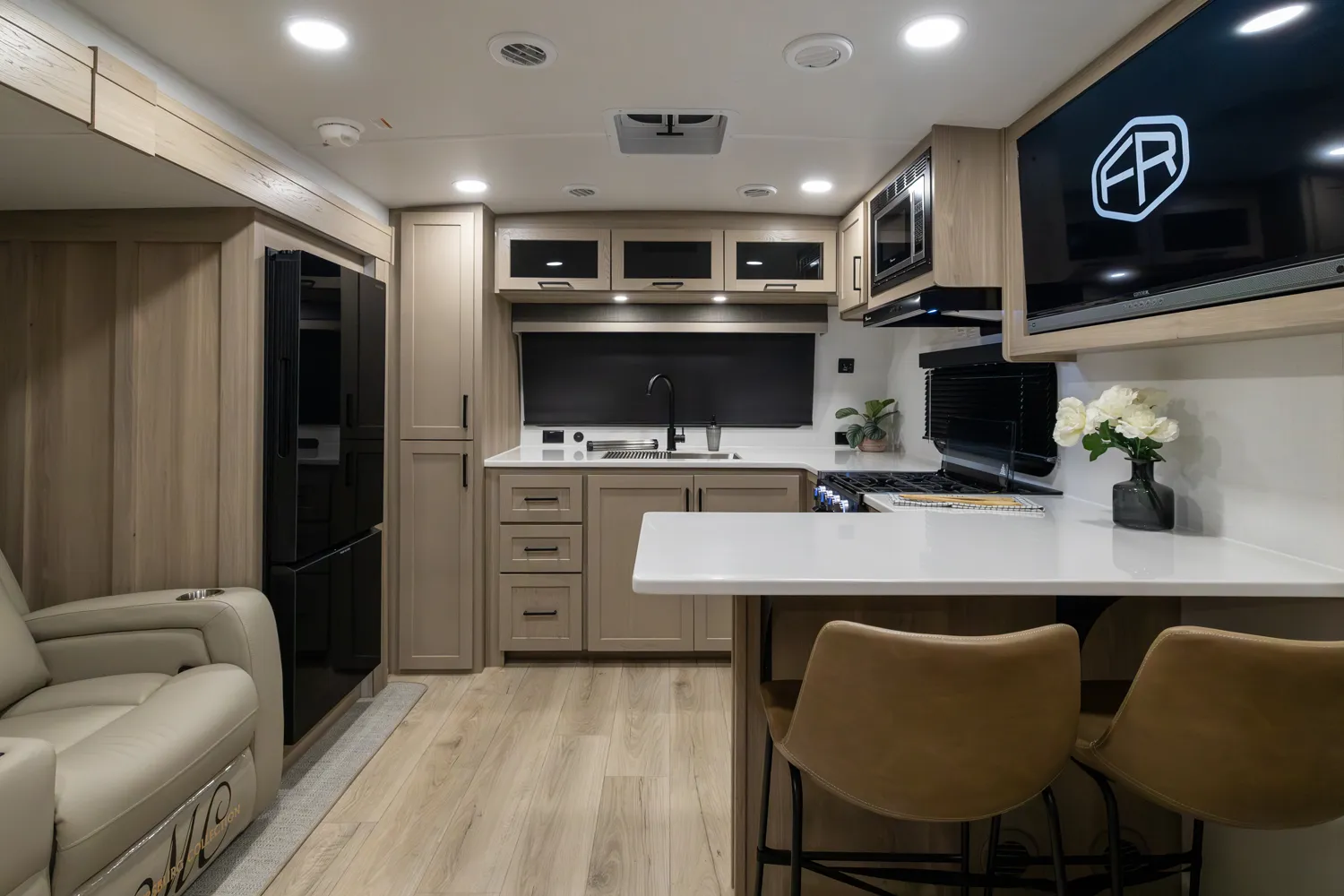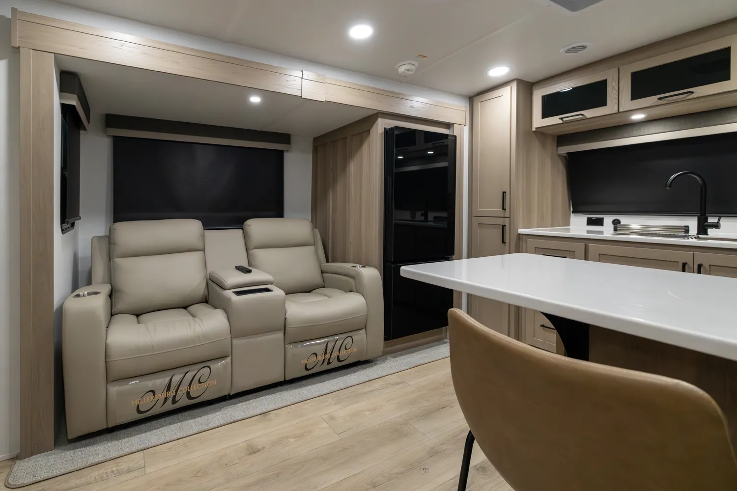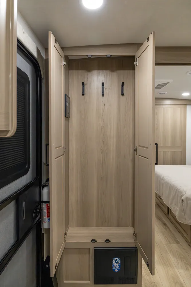 The front kitchen with a large window creates an open, inviting feel with great campsite views. Theater seating faces the entertainment center for easy viewing, with an optional hide-a-bed for guests. The bedroom includes a queen bed in a slide-out, dresser, and wardrobe with washer/dryer prep. A spacious bathroom with a large shower and linen storage adds comfort and convenience, making this coach feel like home.