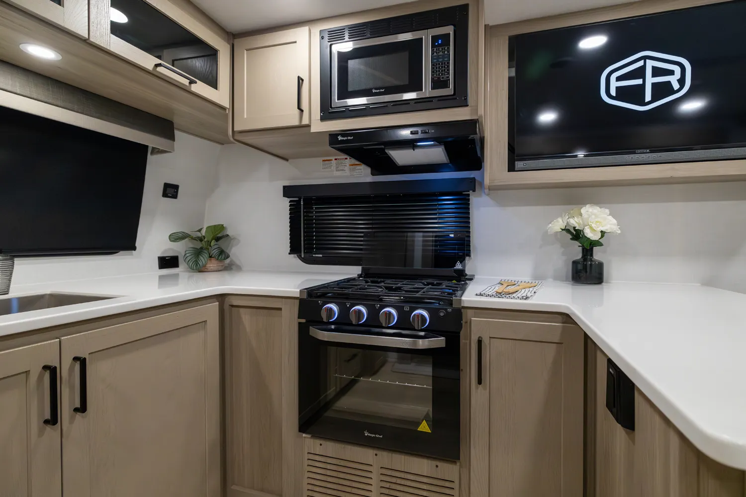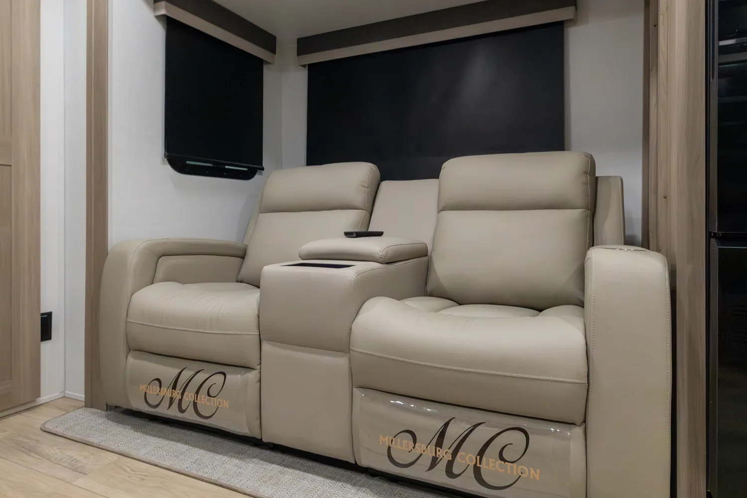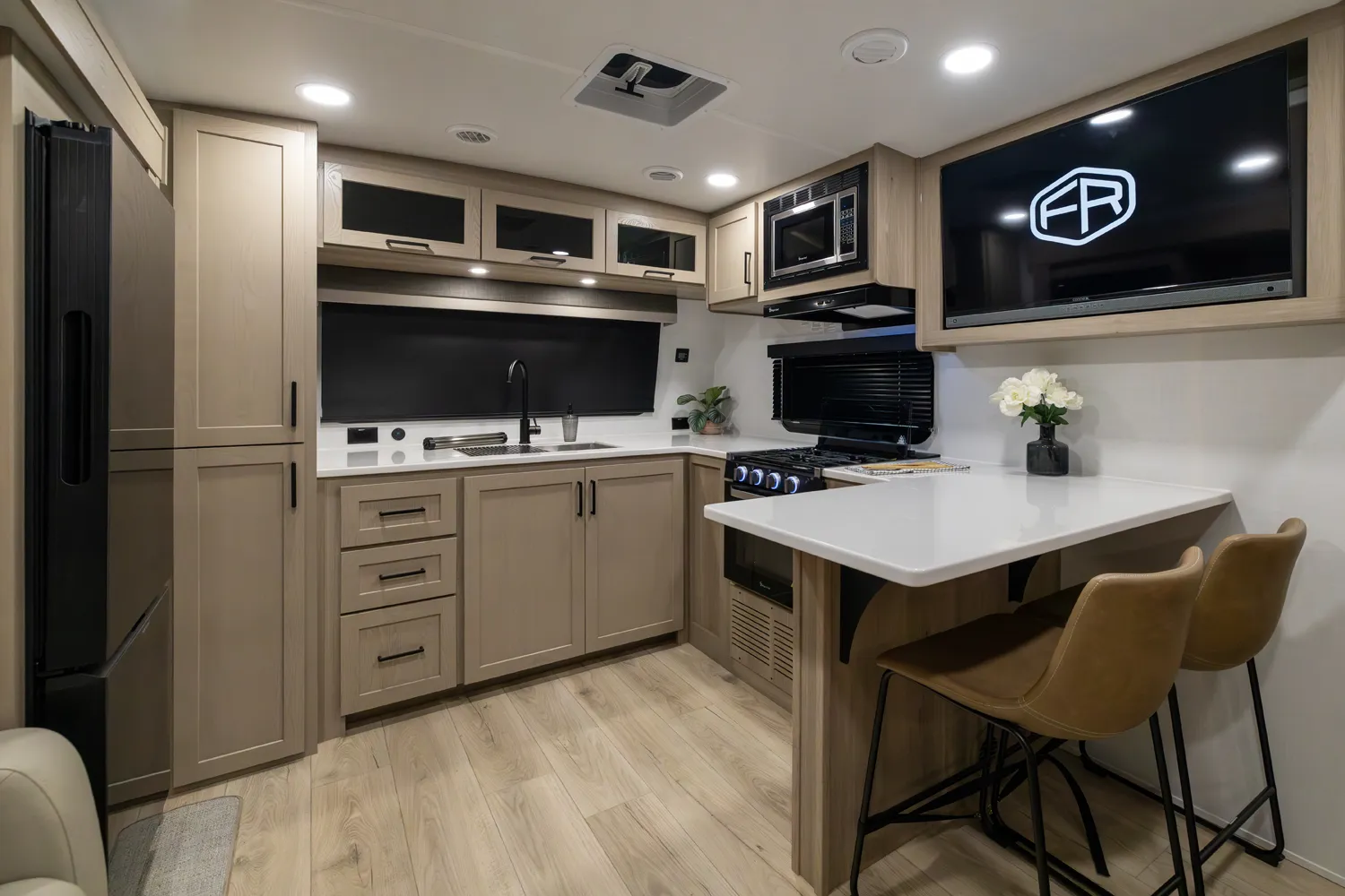 The front kitchen with a large window creates an open, inviting feel with great campsite views. Theater seating faces the entertainment center for easy viewing, with an optional hide-a-bed for guests. The bedroom includes a queen bed in a slide-out, dresser, and wardrobe with washer/dryer prep. A spacious bathroom with a large shower and linen storage adds comfort and convenience, making this coach feel like home.