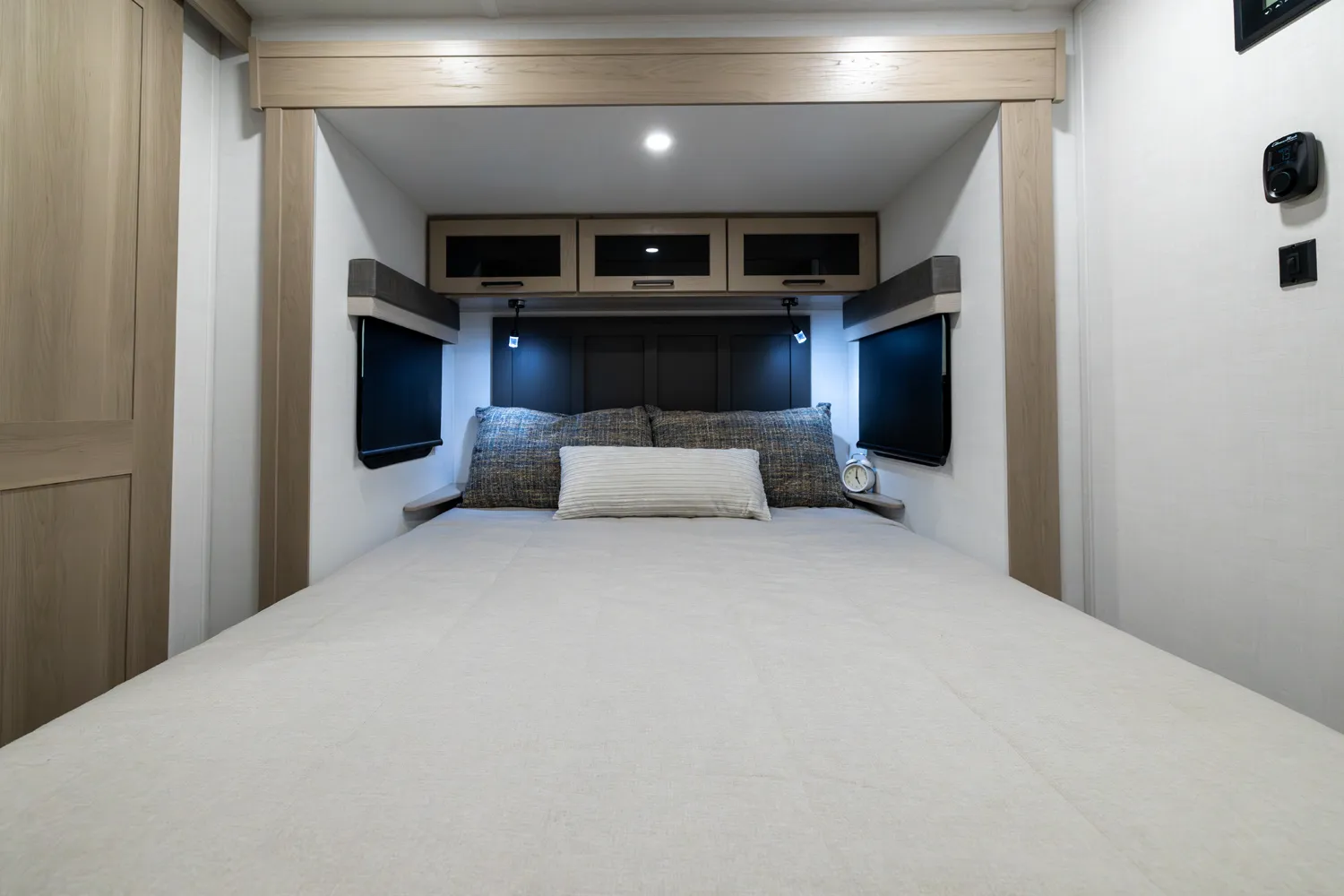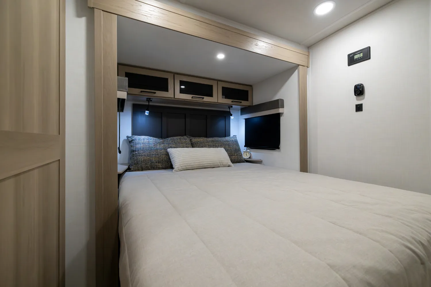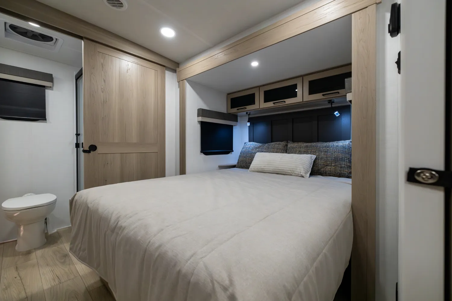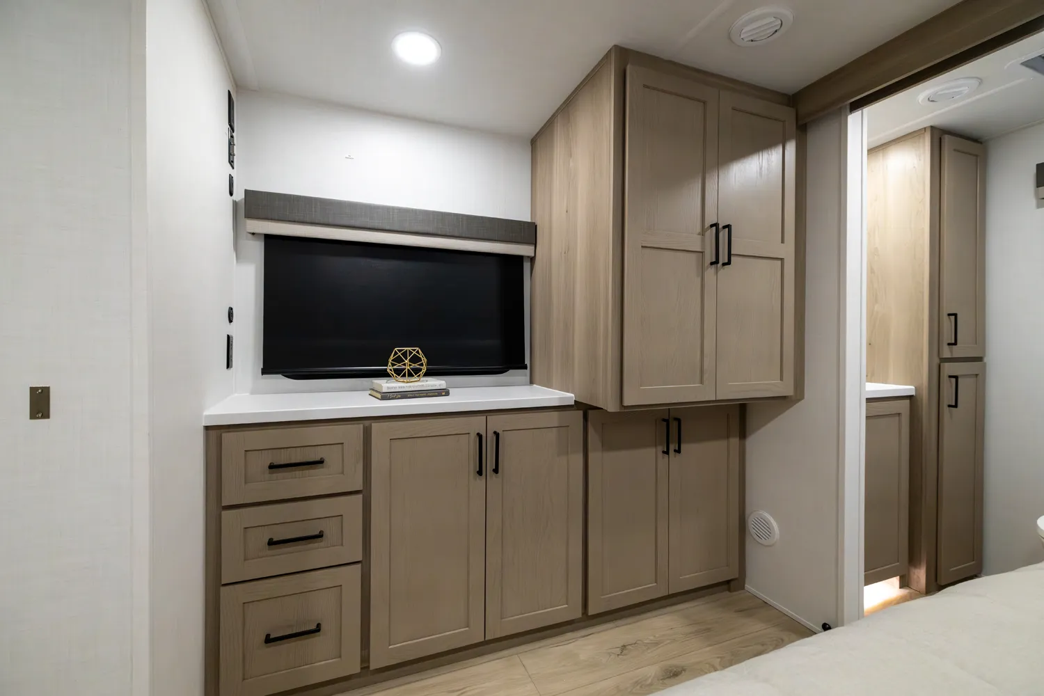 The front kitchen with a large window creates an open, inviting feel with great campsite views. Theater seating faces the entertainment center for easy viewing, with an optional hide-a-bed for guests. The bedroom includes a queen bed in a slide-out, dresser, and wardrobe with washer/dryer prep. A spacious bathroom with a large shower and linen storage adds comfort and convenience, making this coach feel like home.