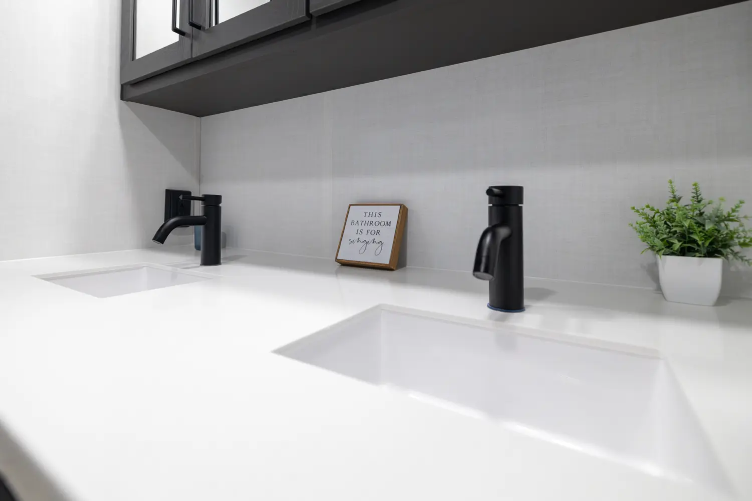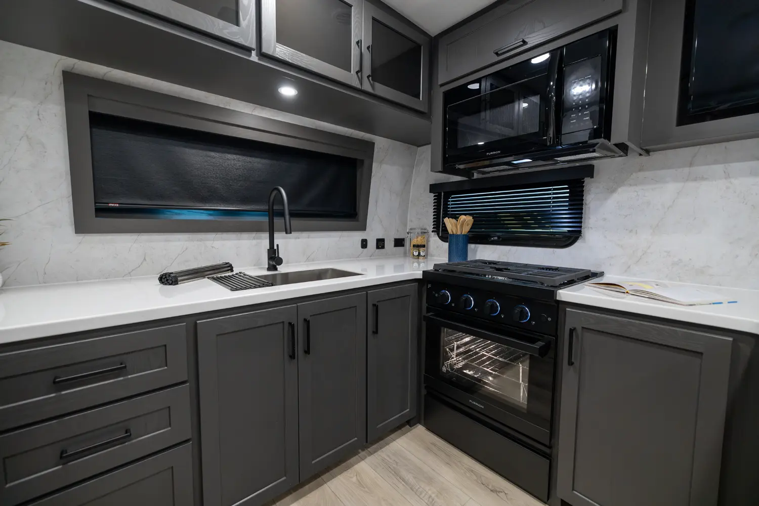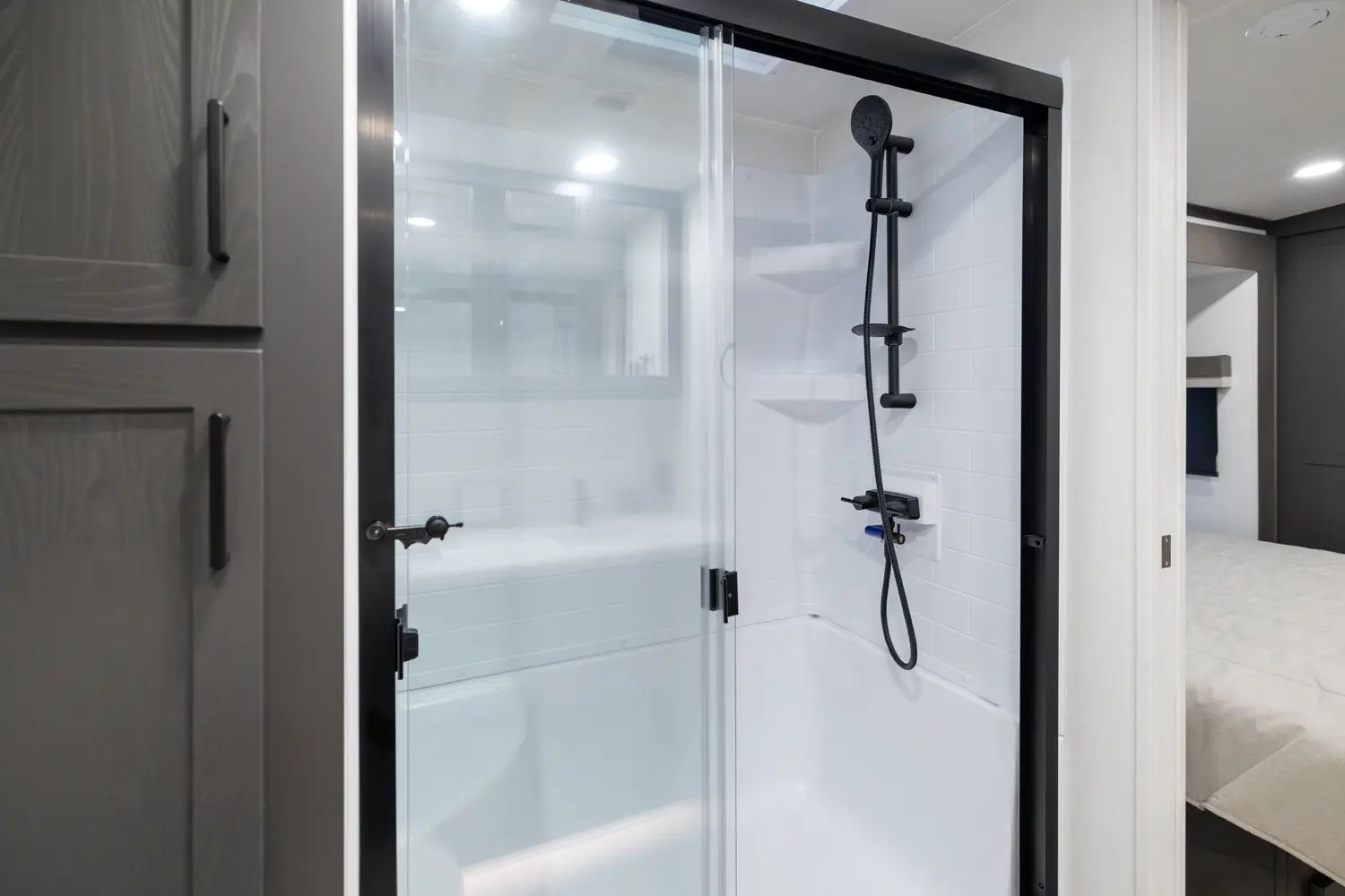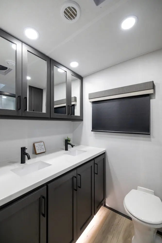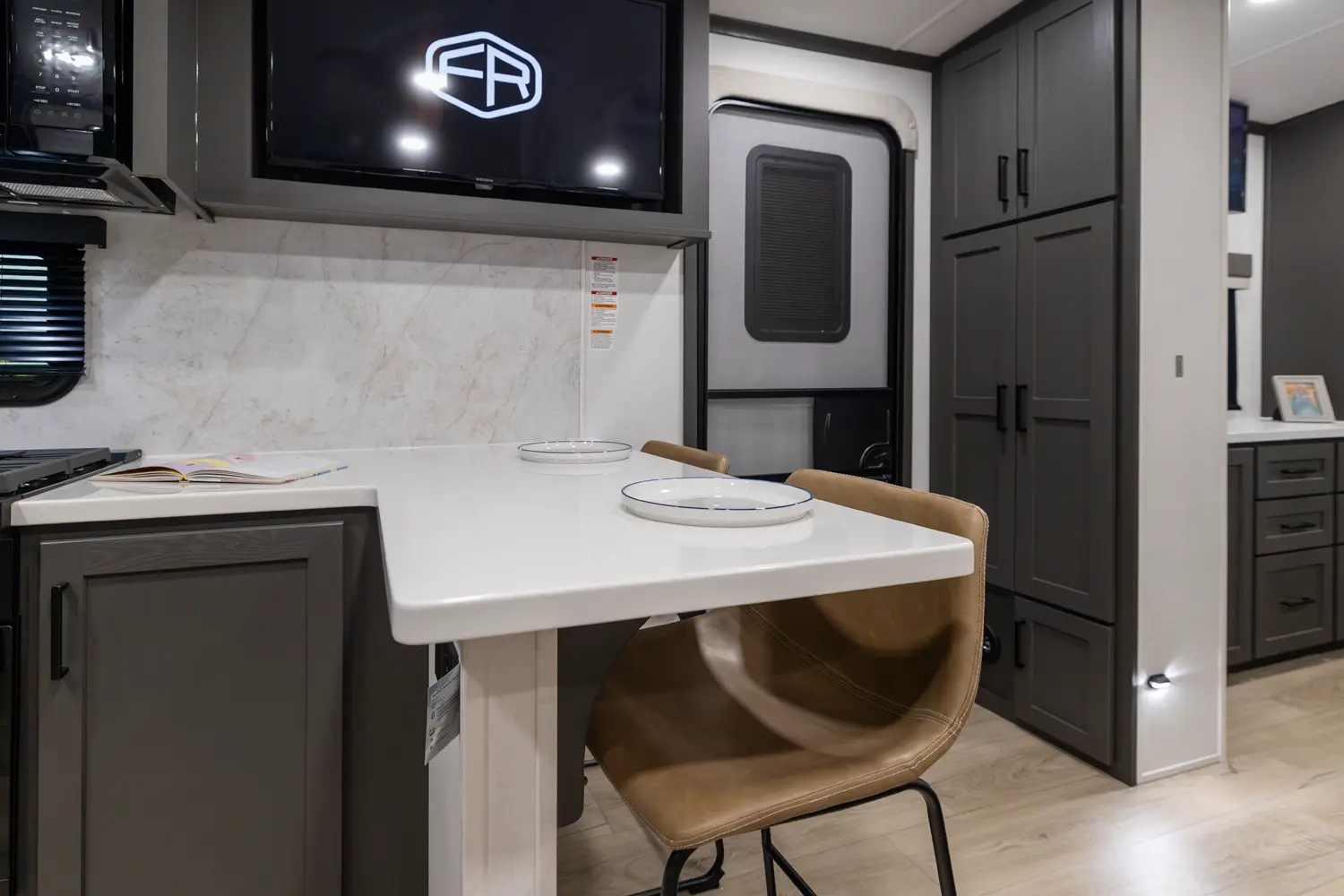 The two person bar top seating and a large window in the front give this coach an open feel with the ability to see your campsite. The theater seating is directly across the entertainment center for easy viewing and comfort. The bedroom in this unit is the game changer with a king bed in a slide out, a large wardrobe and dresser in the middle of this bedroom is perfect. A bathroom with a double sink vanity and 48” x 30” shower with a seat make this bathroom truly a master.