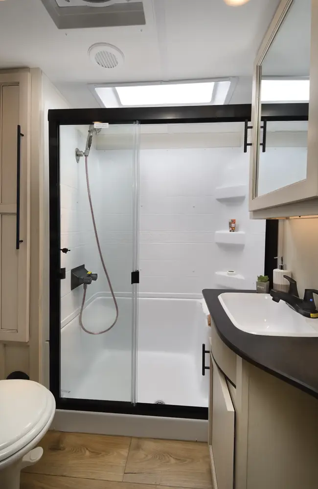 Discover the future of 5th wheel RV living with the Sabre Sundeck 33RLP by Forest River. This innovative RV features an industry-first retractable patio deck, extending your outdoor living space. Inside, you’ll find a L-shaped sectional, perfect for relaxation, and an impressive entertainment center complete with a fireplace. The fully equipped kitchen is a chef’s dream, boasting ample solid surface countertops, a residential-style oven, an air fryer microwave, and a 12-volt refrigerator.