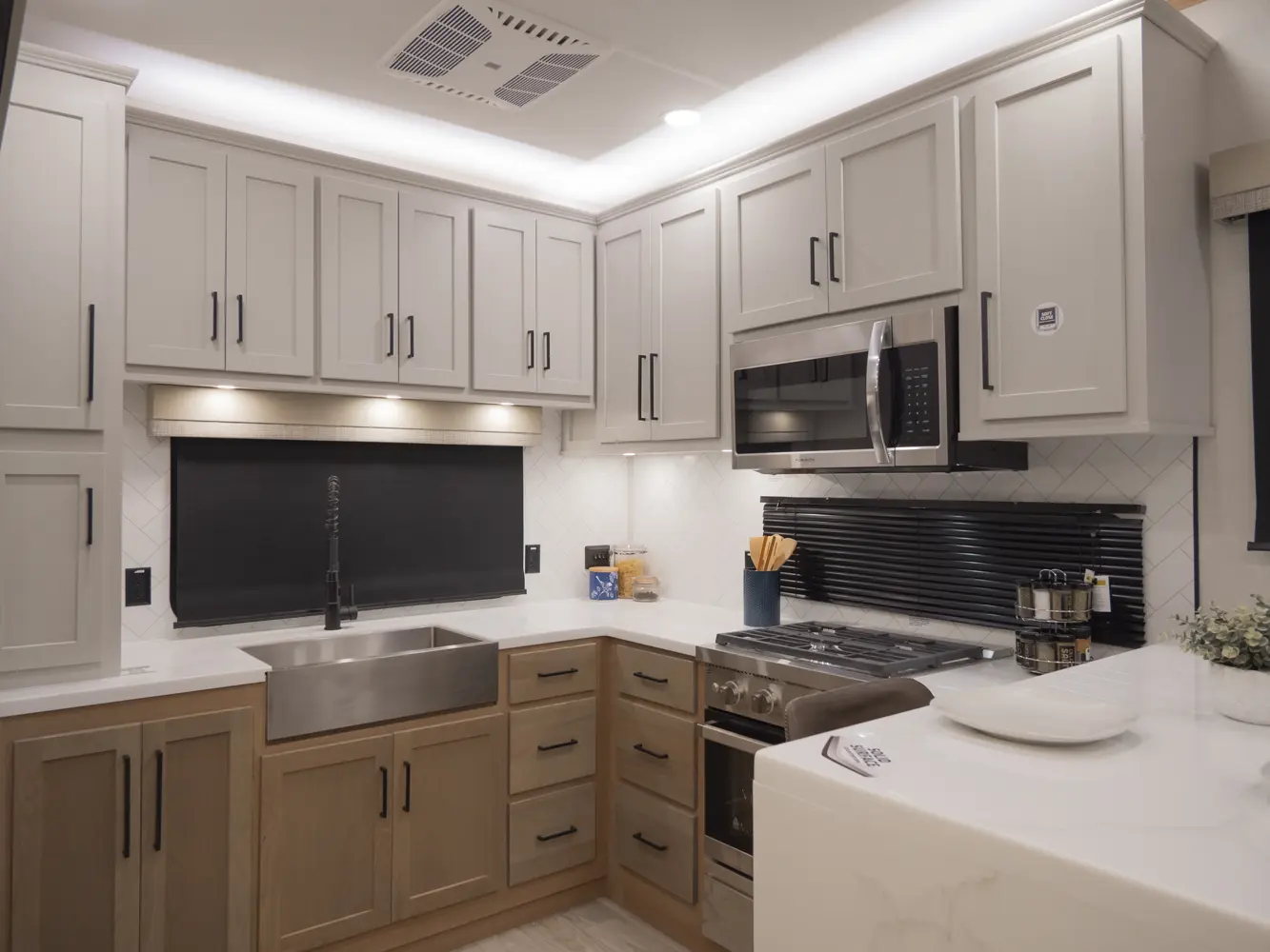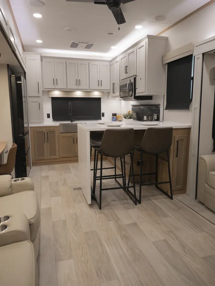 The Sierra Destination 395MMG floorplan has one entry and four slide outs. Exterior features include: fiberglass exterior and 21' awning. Interiors features include: rear kitchen.