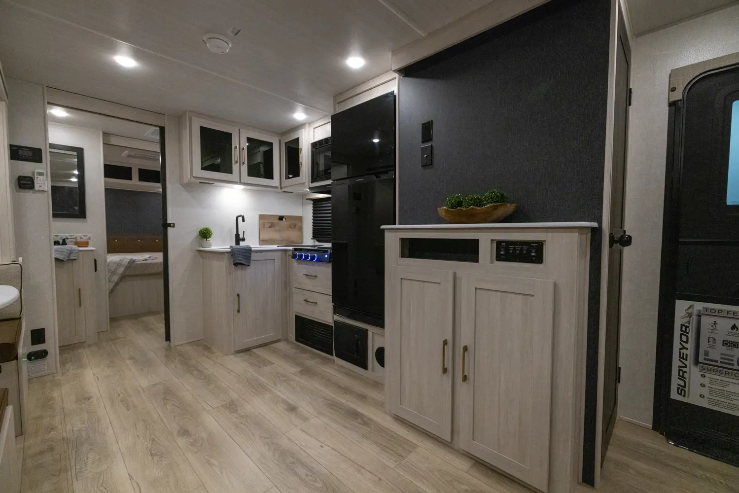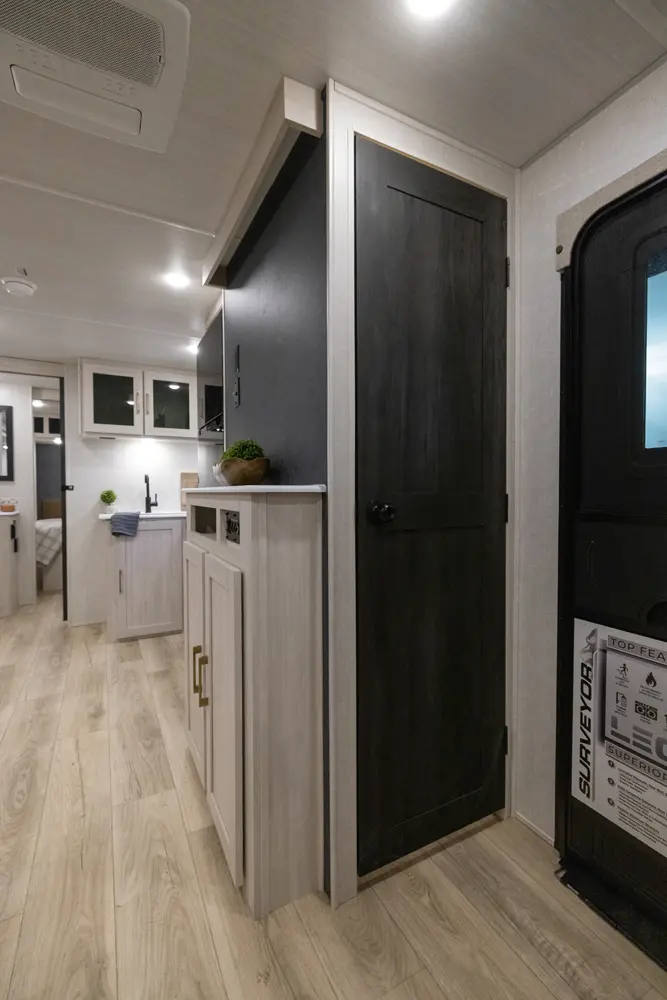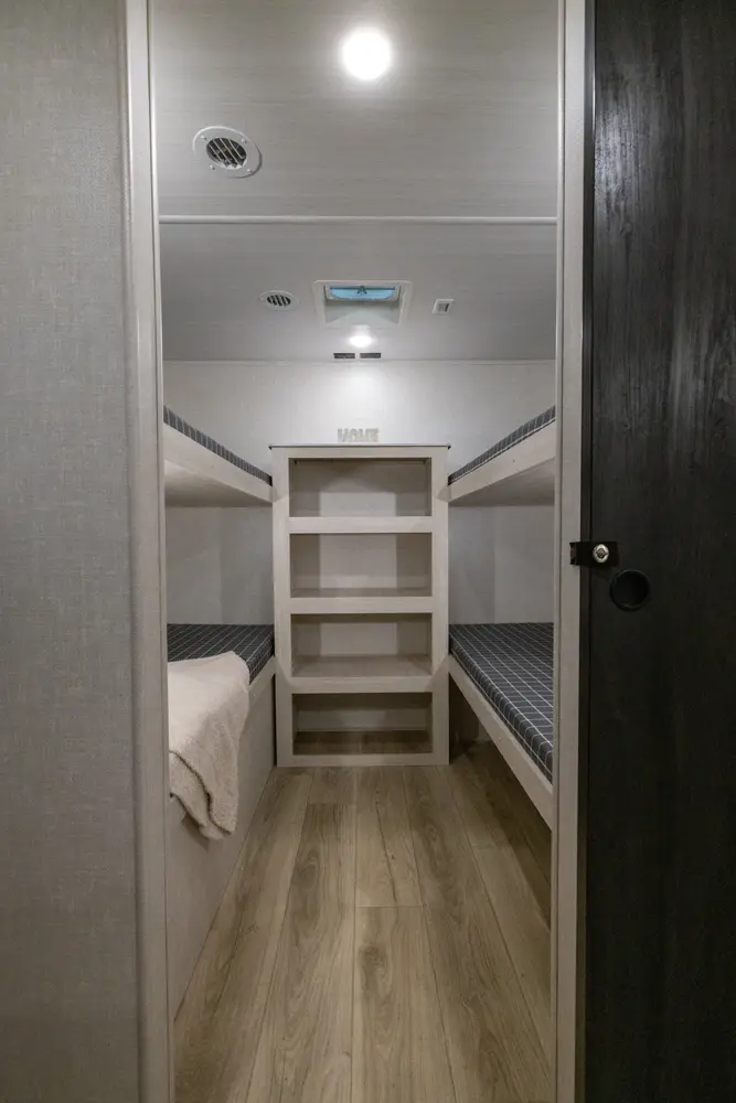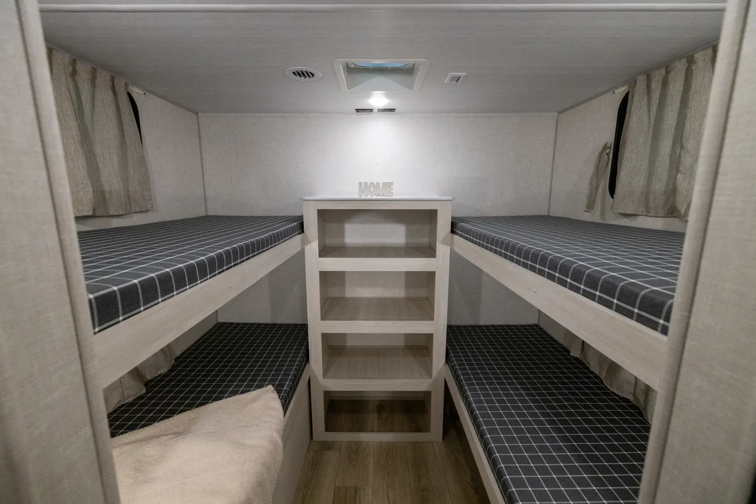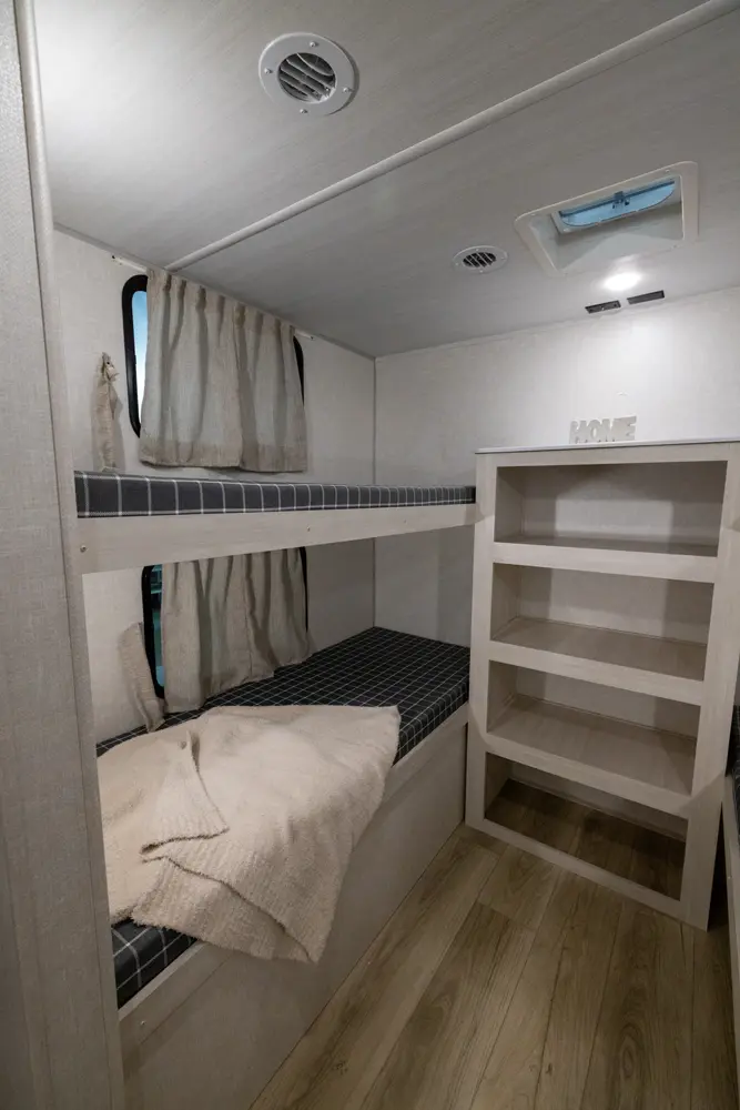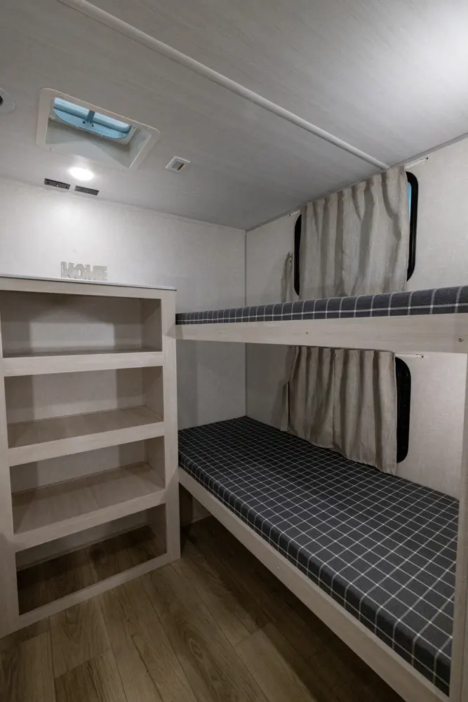The Surveyor Legend X 29CAMP floorplan has one entry and one slide out. Exterior features include: fiberglass exterior and 21' awning. Interiors features include: bunk beds, front bedroom and pass through bathroom.