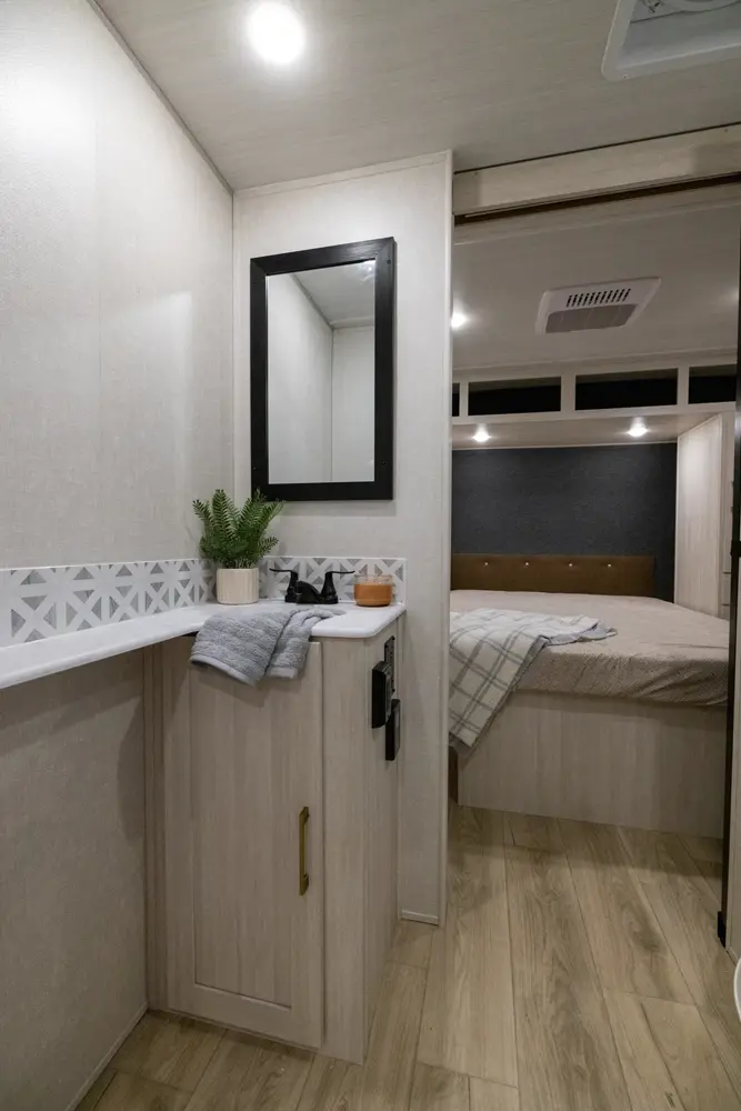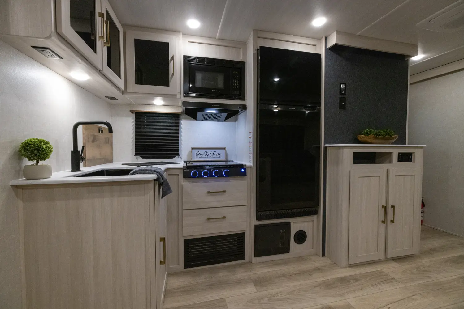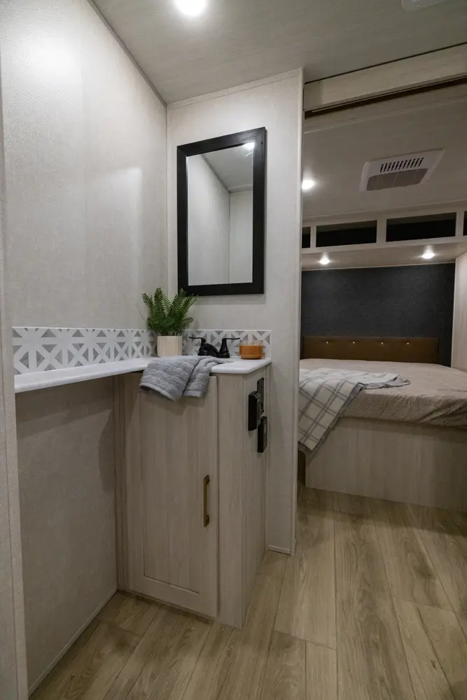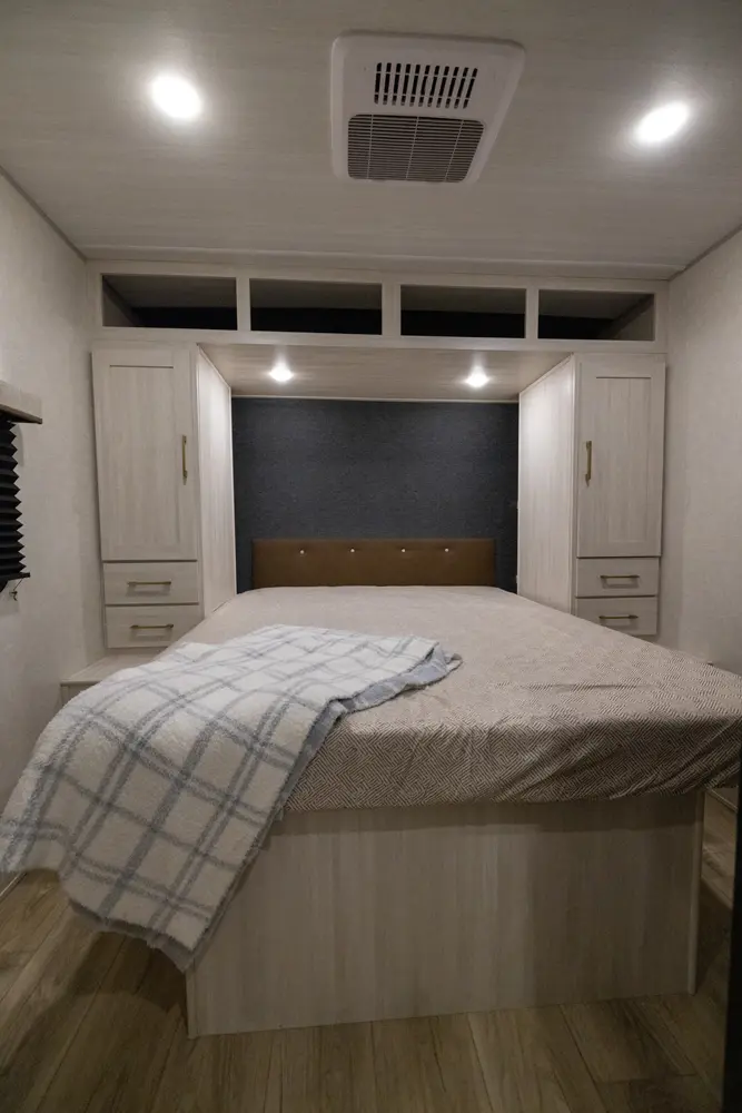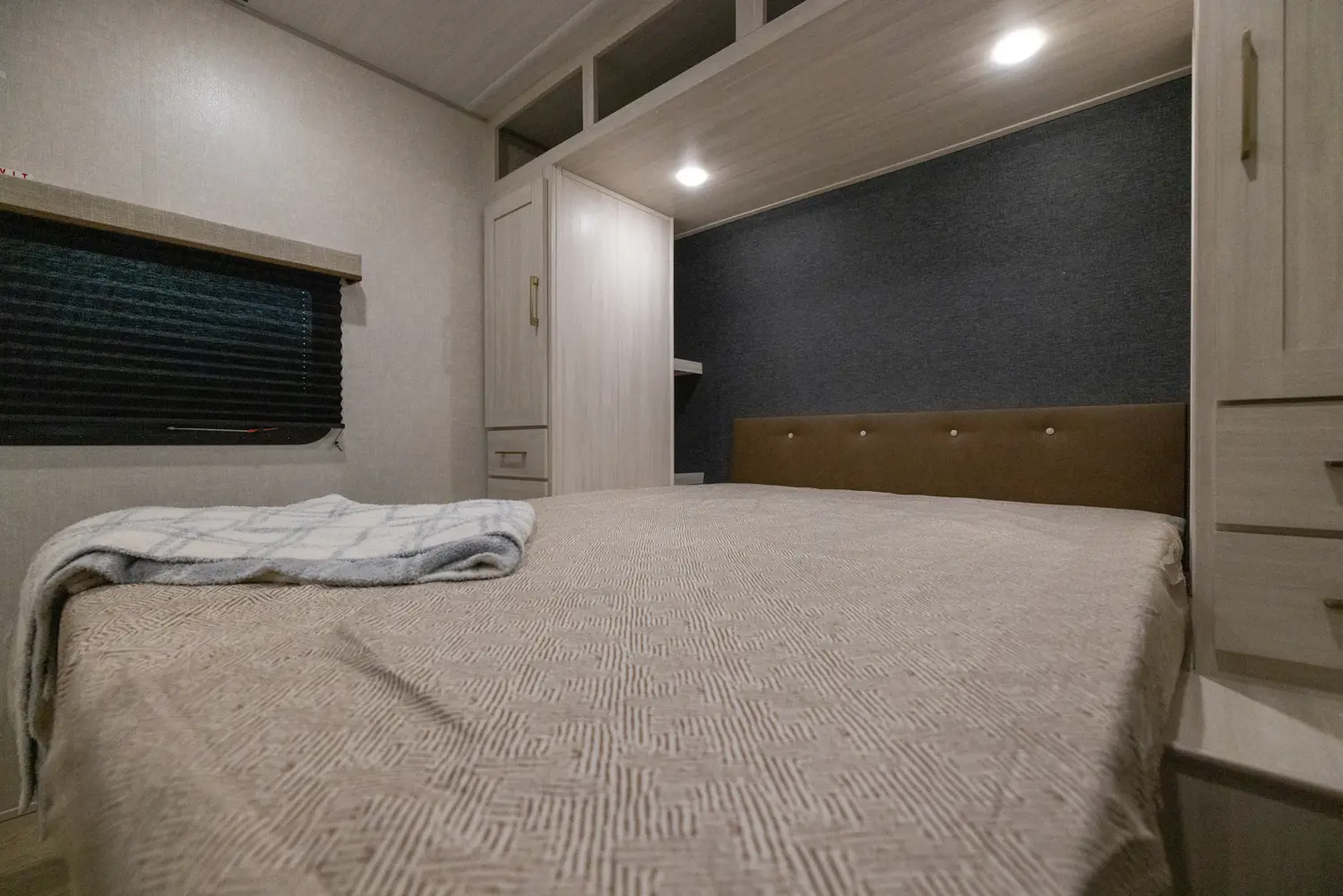 The Surveyor Legend X 29CAMP floorplan has one entry and one slide out. Exterior features include: fiberglass exterior and 21' awning. Interiors features include: bunk beds, front bedroom and pass through bathroom.