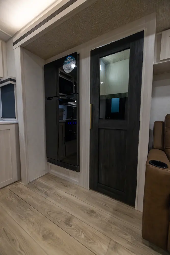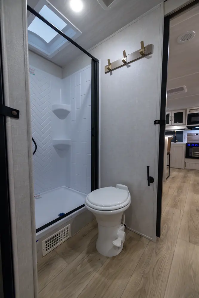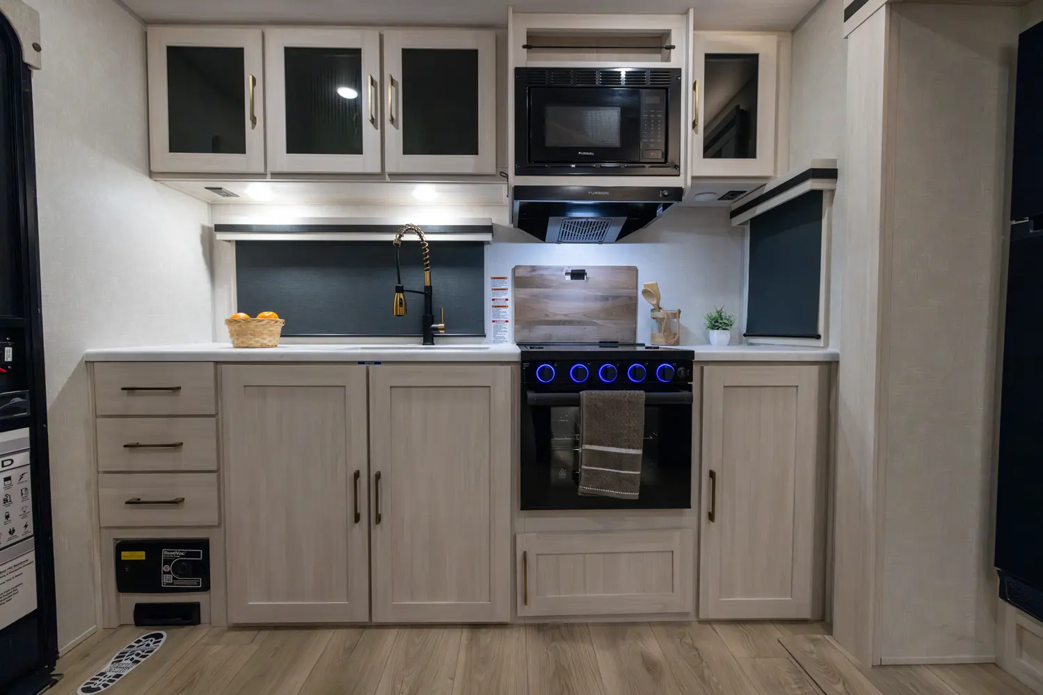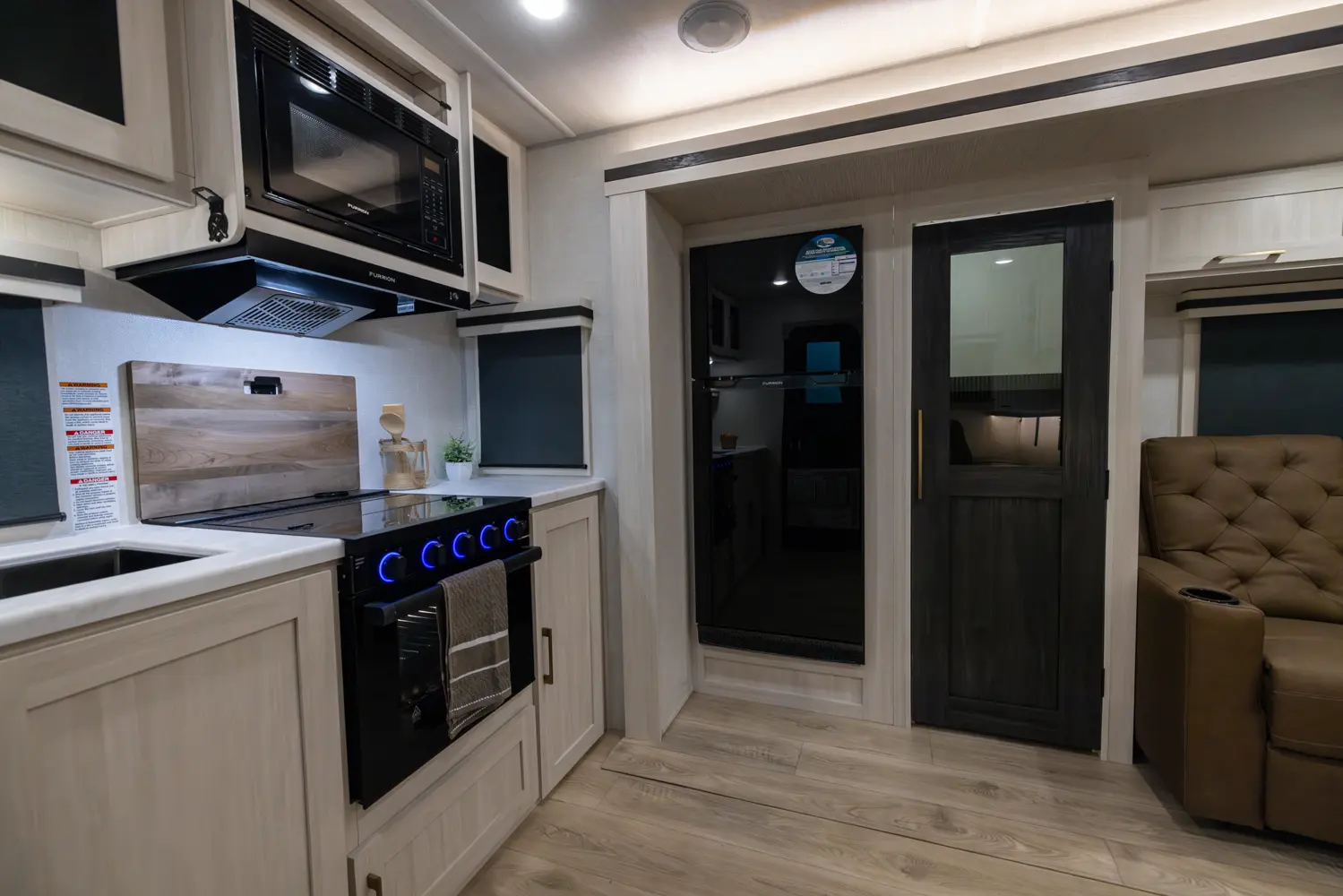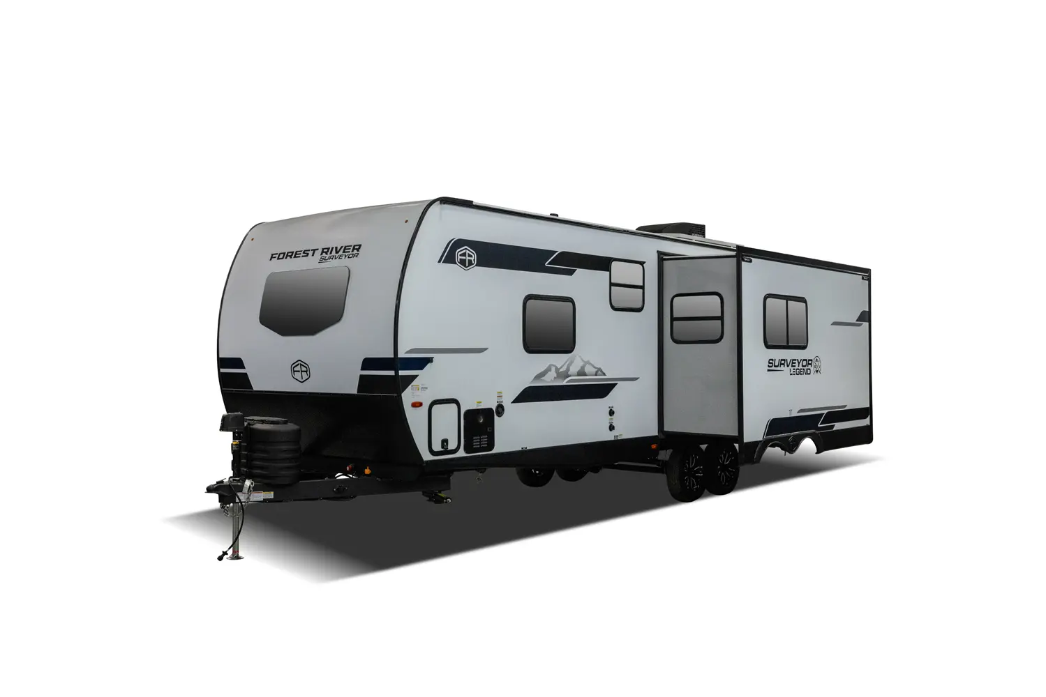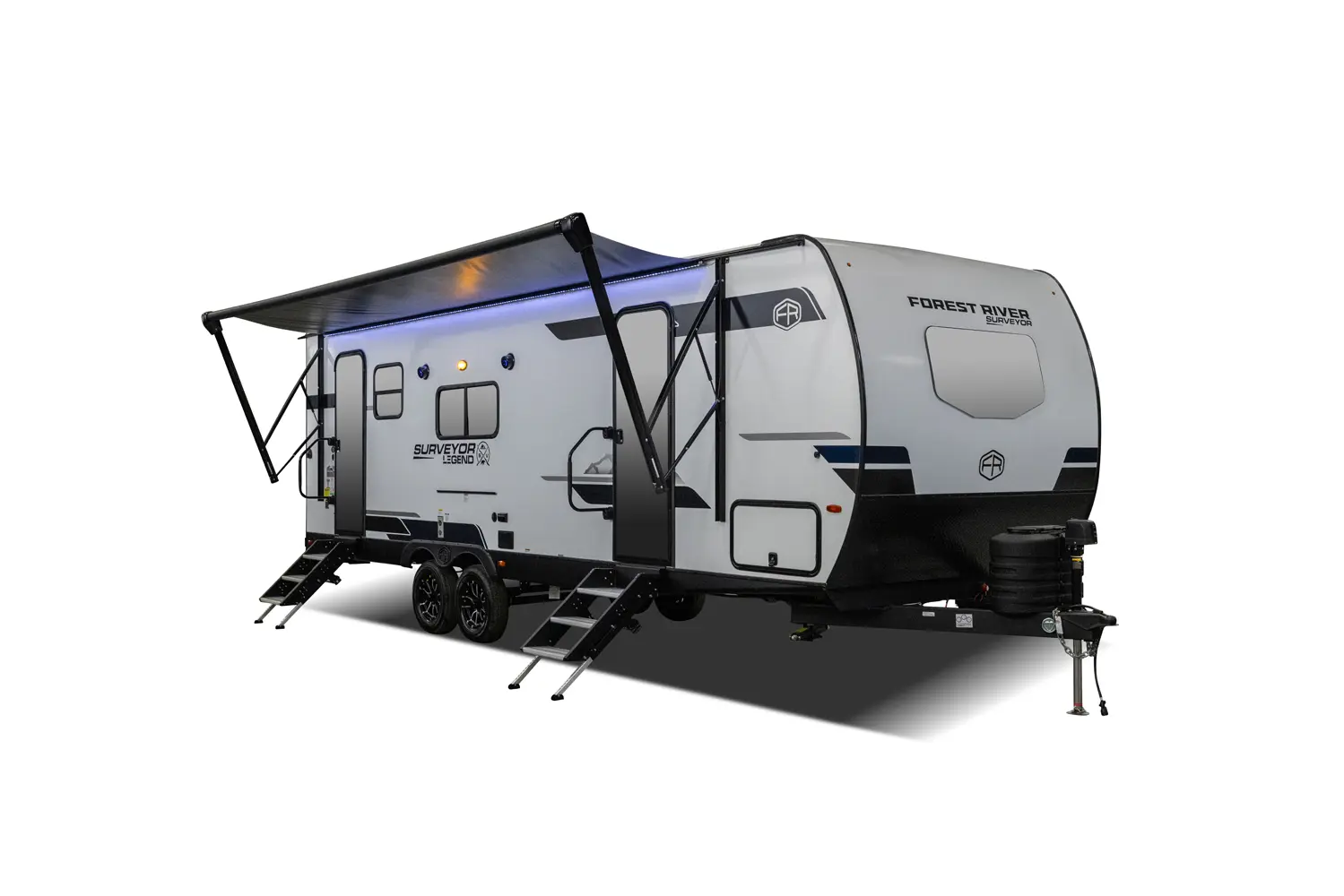 The Surveyor Legend 261RKLE floorplan has two entries and one slide out. Exterior features include: fiberglass exterior and outside kitchen. Interiors features include: rear kitchen, front bedroom and pass through bathroom.