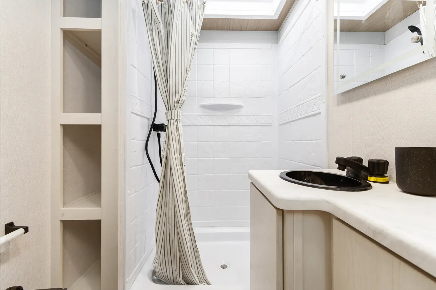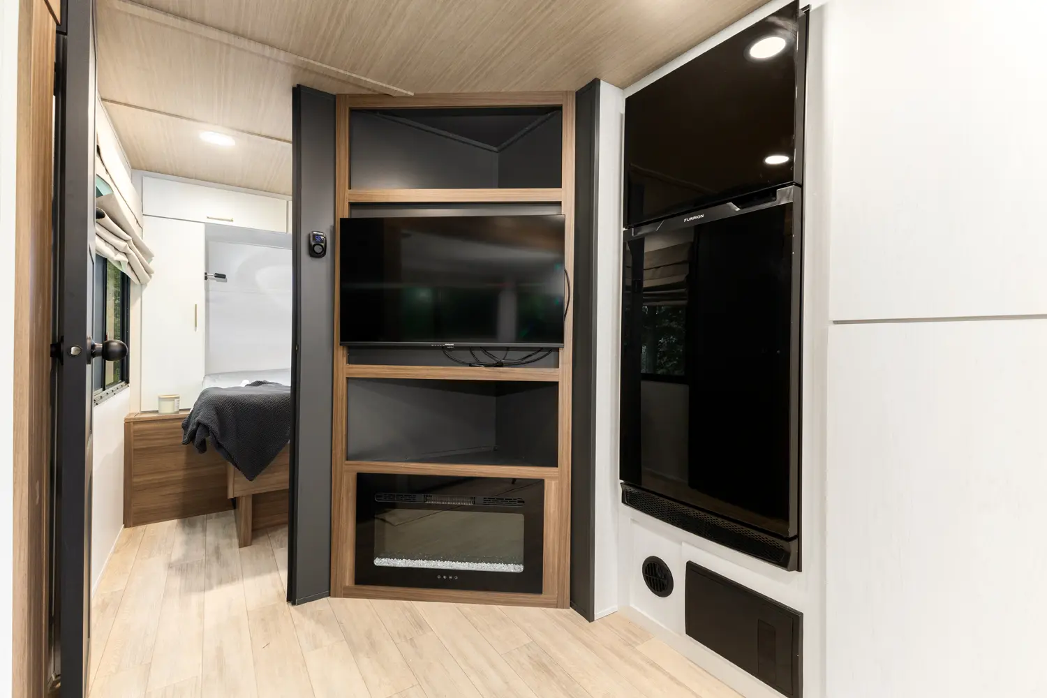 • Universal Docking Station Enclosed in Cargo Storage - Hookups Included: Cable & Satellite Switch, Fresh-Tank Gravity Fill, City Water, Black Tank Flush, Winterization Pump, Outdoor Shower, GFI Outlet, And Space Prepped for Solar Panel Controller