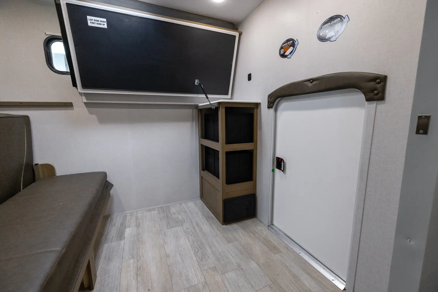 The 29VBUD has one slideout and one entry. Exterior features include an 18 foot awning, exterior camp kitchen, step above entry steps, front pass-thru storage, battery disconnect, and removable underbelly panels. Interior layout front to back: custom versa-tilt king bed with closet and night stands on each side, and overhead cabinet, and door side closet; door side full bathroom with walk-in shower; entertainment center with fireplace along inner wall; off-door side slideout with versa lounge/u-dinette and panoramic windows; door side entry, peninsula kitchen counter with sink, overhead cabinets, microwave, oversized refrigerator, and walk-in pantry; rear bunk room with versa bunks on rear and door side above and a versa queen below.
