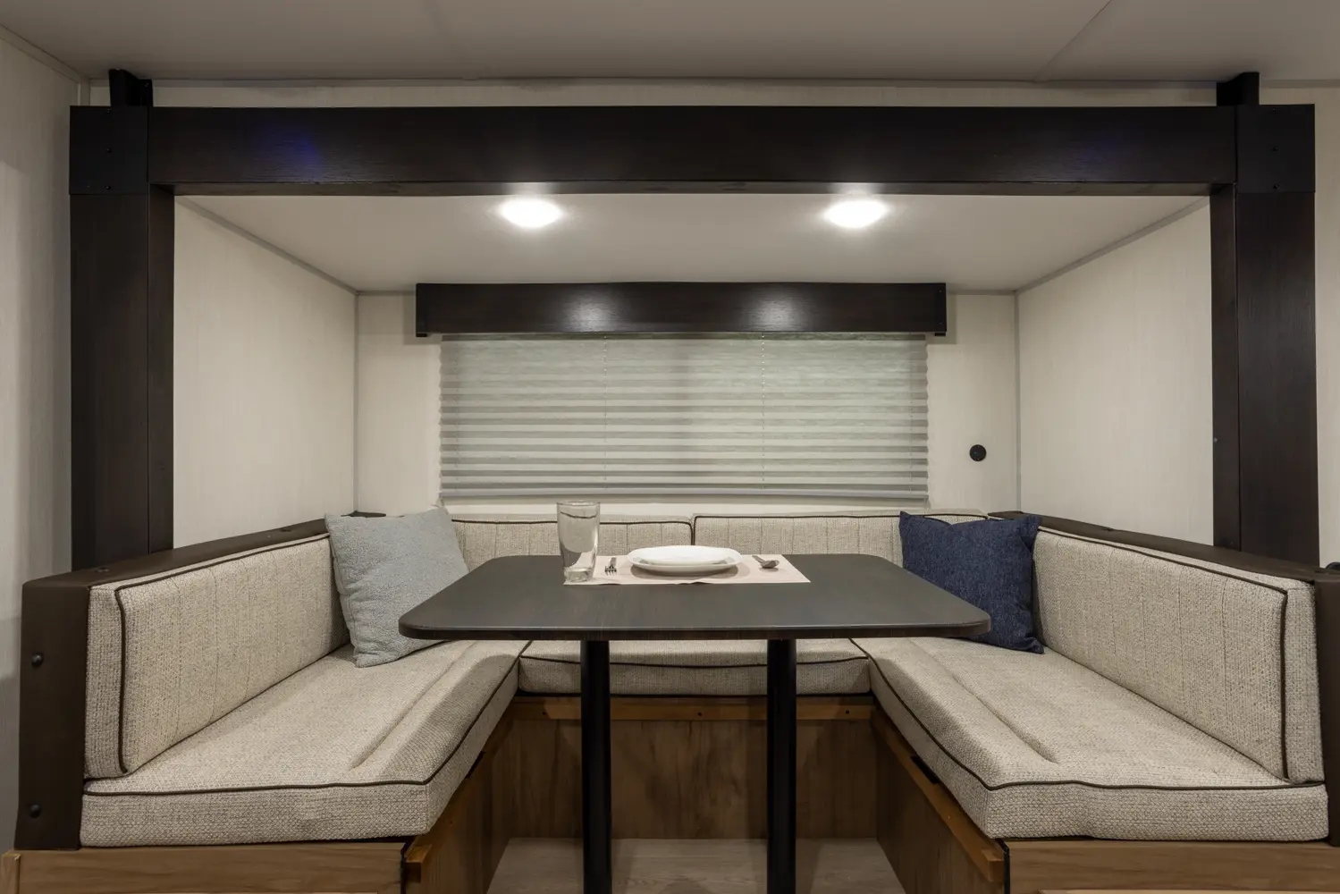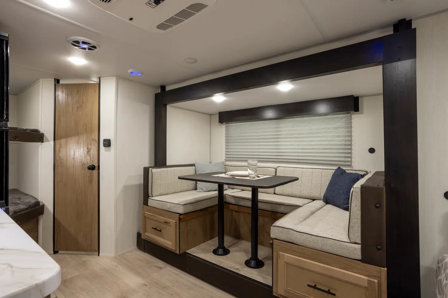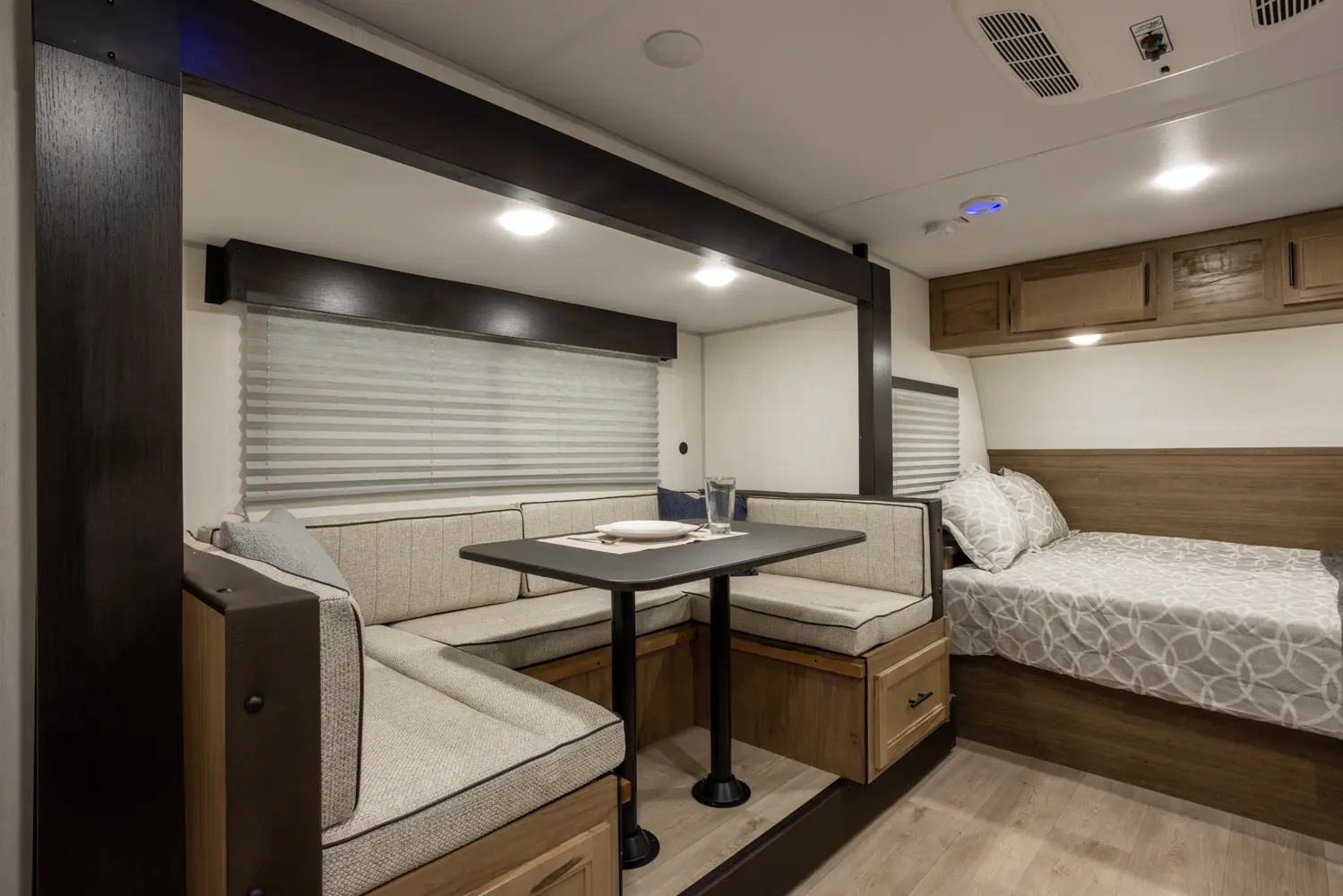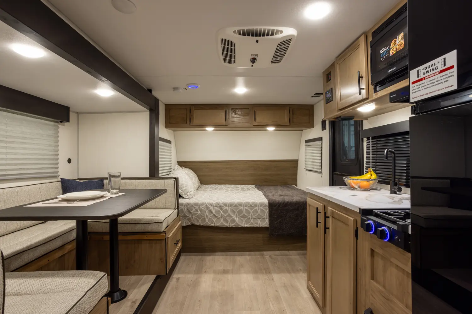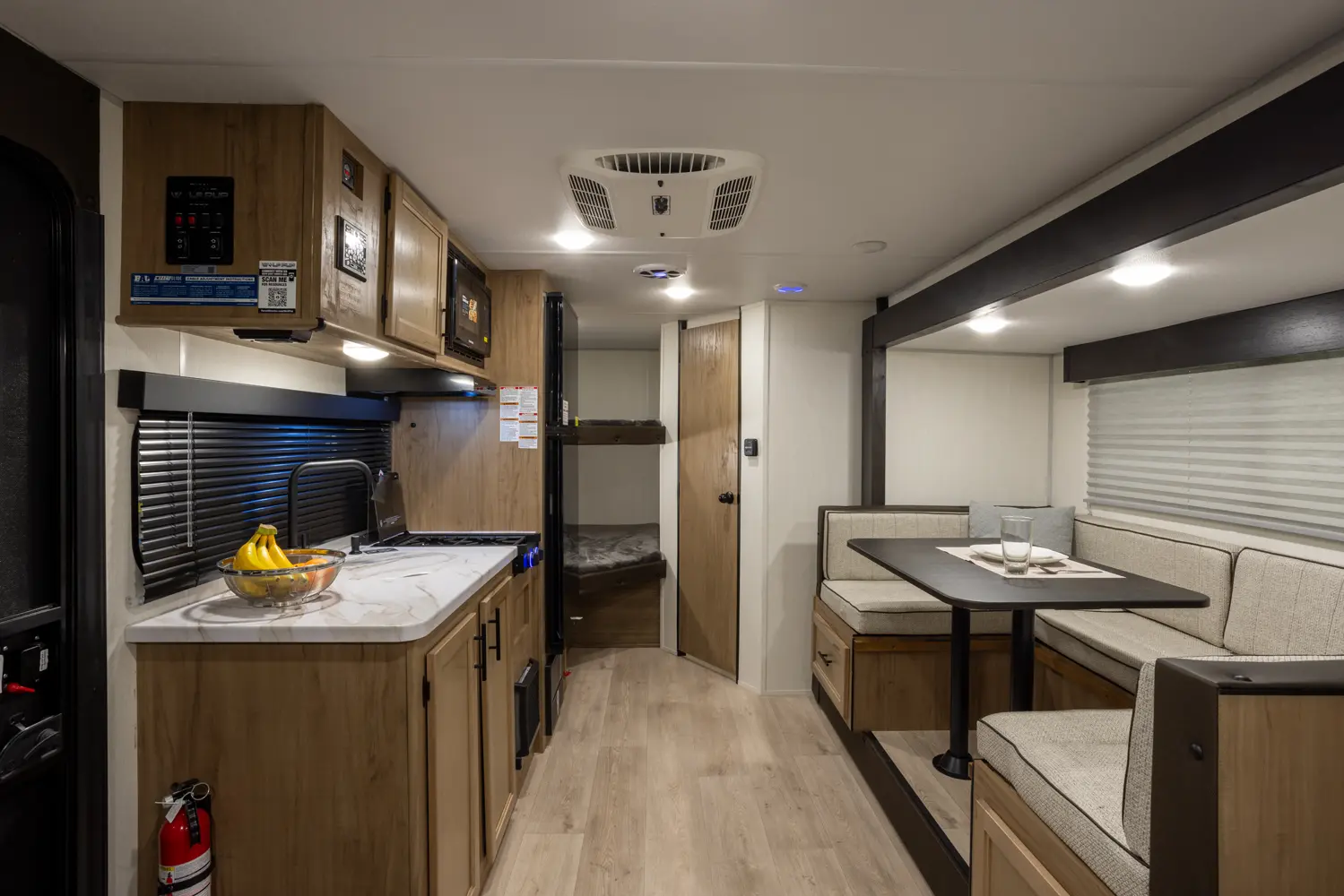 The Wolf Pup 17JW floorplan has one entry and one slide out. Exterior features include: metal exterior, 12' awning and outside kitchen. Interiors features include: bunk beds, u-dinette and front bedroom.