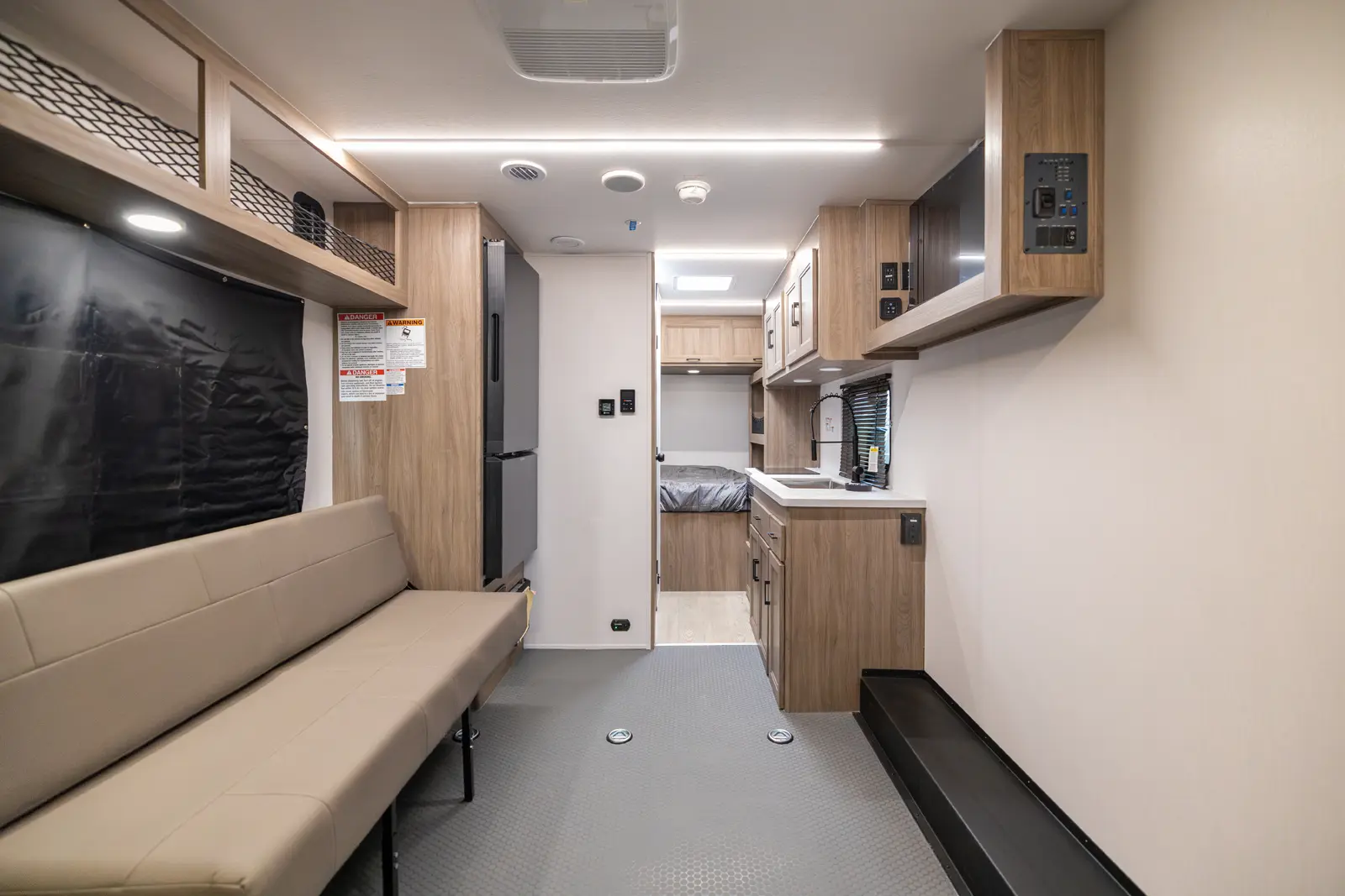 The Work & Play 18LT balances rugged cargo space and compact agility. With its reinforced ramp, built-in tie-downs, and heavy-duty construction, it hauls bikes or ATVs to trailheads. After a day of adventure the interior becomes a cozy retreat, giving you a dependable base for weekend getaways or action-packed road trips.
