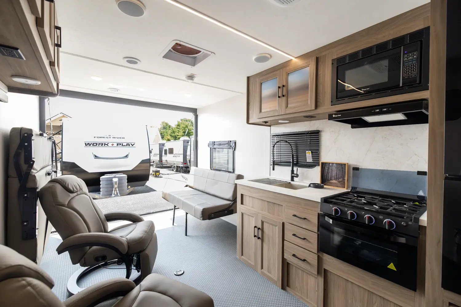 At 27' 5", the Work & Play 21LT expands garage room while still staying tow-friendly for outdoor enthusiasts. The large cargo bay handles your gear, and the interior supports both gear storage and comfortable breaks. Ideal for off-road adventures or family trailside escapes.